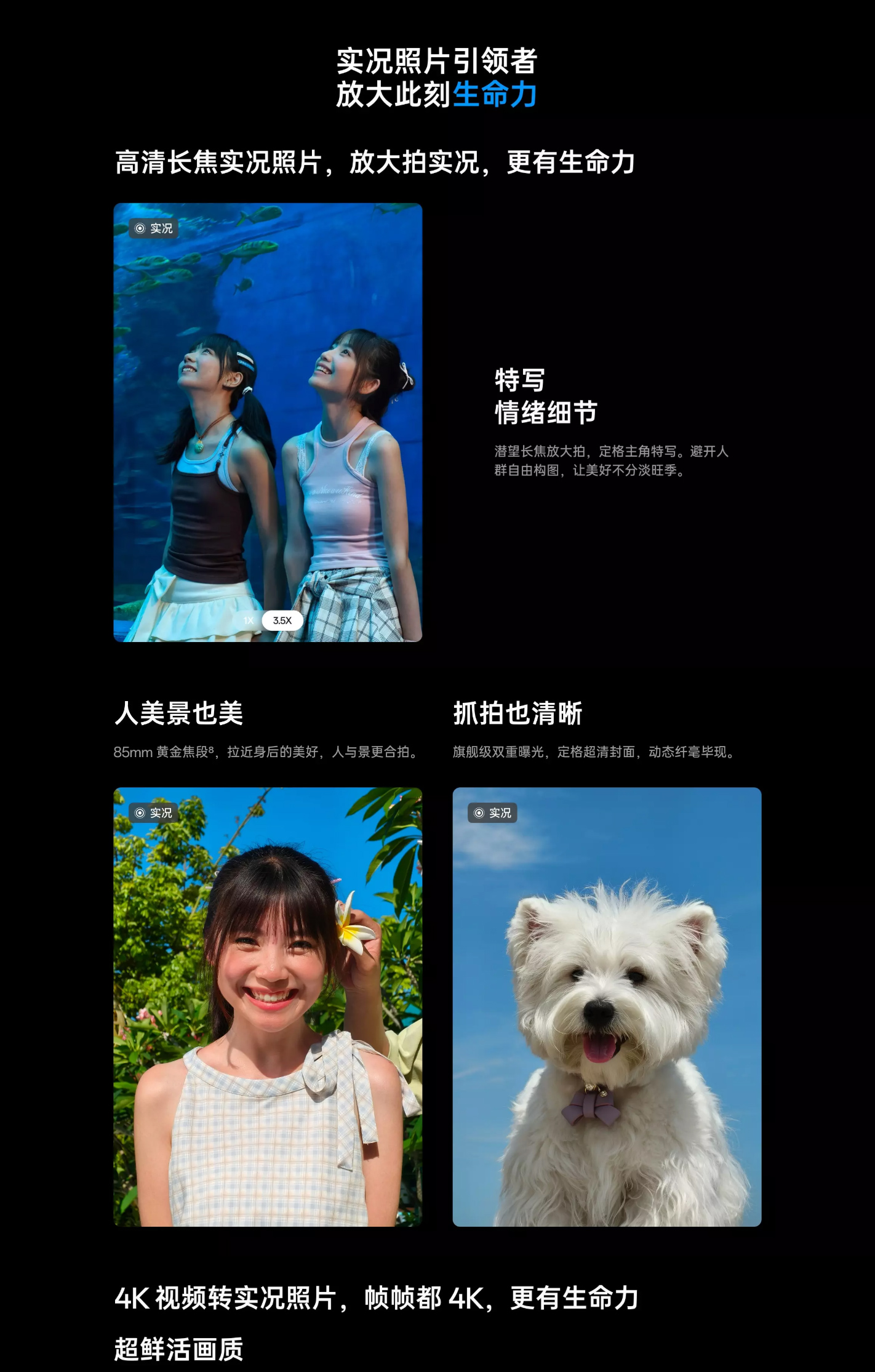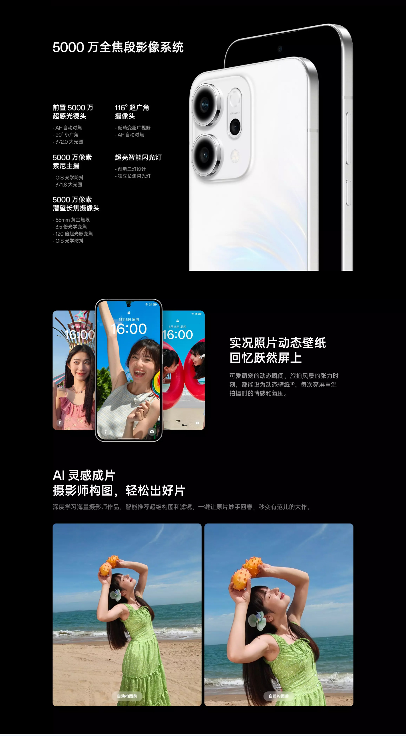 后置拍照功能:照片,視頻,人像,夜景,專業(yè),全景,電影,慢動(dòng)作,多景錄像,延時(shí)攝影,萌拍,AI 證件照,高像素,水下相機(jī),掃一掃