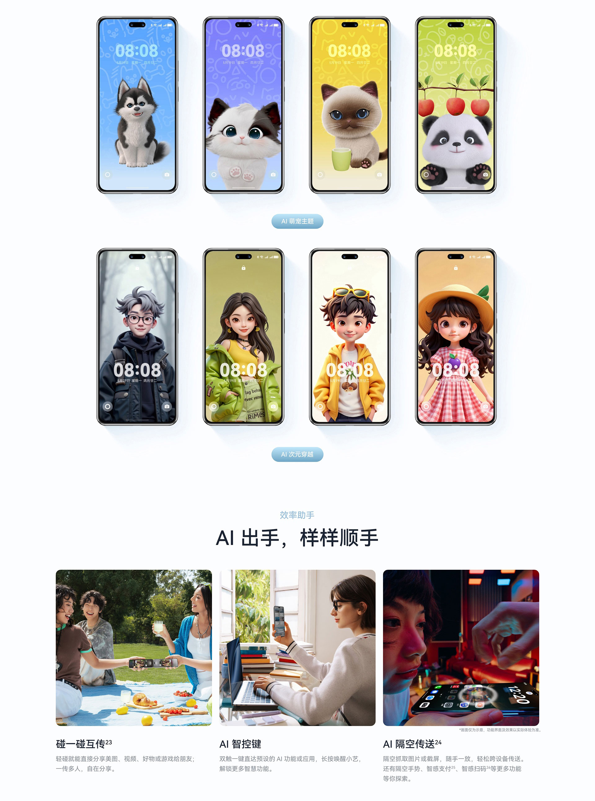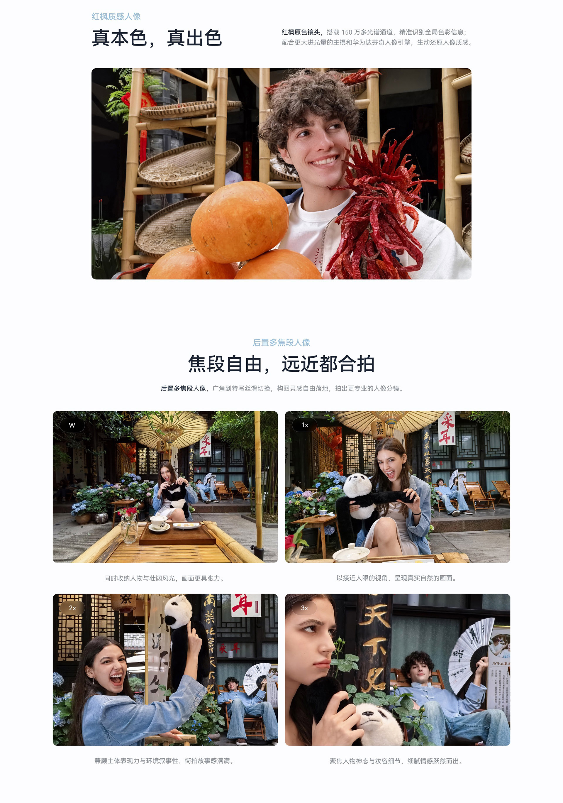 后置拍照功能:最大可支持 8192 x 6144像素,AI動態(tài)照片、視頻 HDR Vivid、風馳閃拍、智能可變光圈、物理光圈可調、夜景模式、超級微距、微距視頻、微距畫中畫、長焦畫中畫、高像素模式、延時攝影、超大廣角、大光圈虛化、人像模式、專業(yè)模式、慢動作、全景模式、濾鏡、AI攝影大師、笑臉抓拍、聲控拍照、連拍、定時拍攝、自動添加水印、短視頻、人像追焦、人像留色、人像虛化