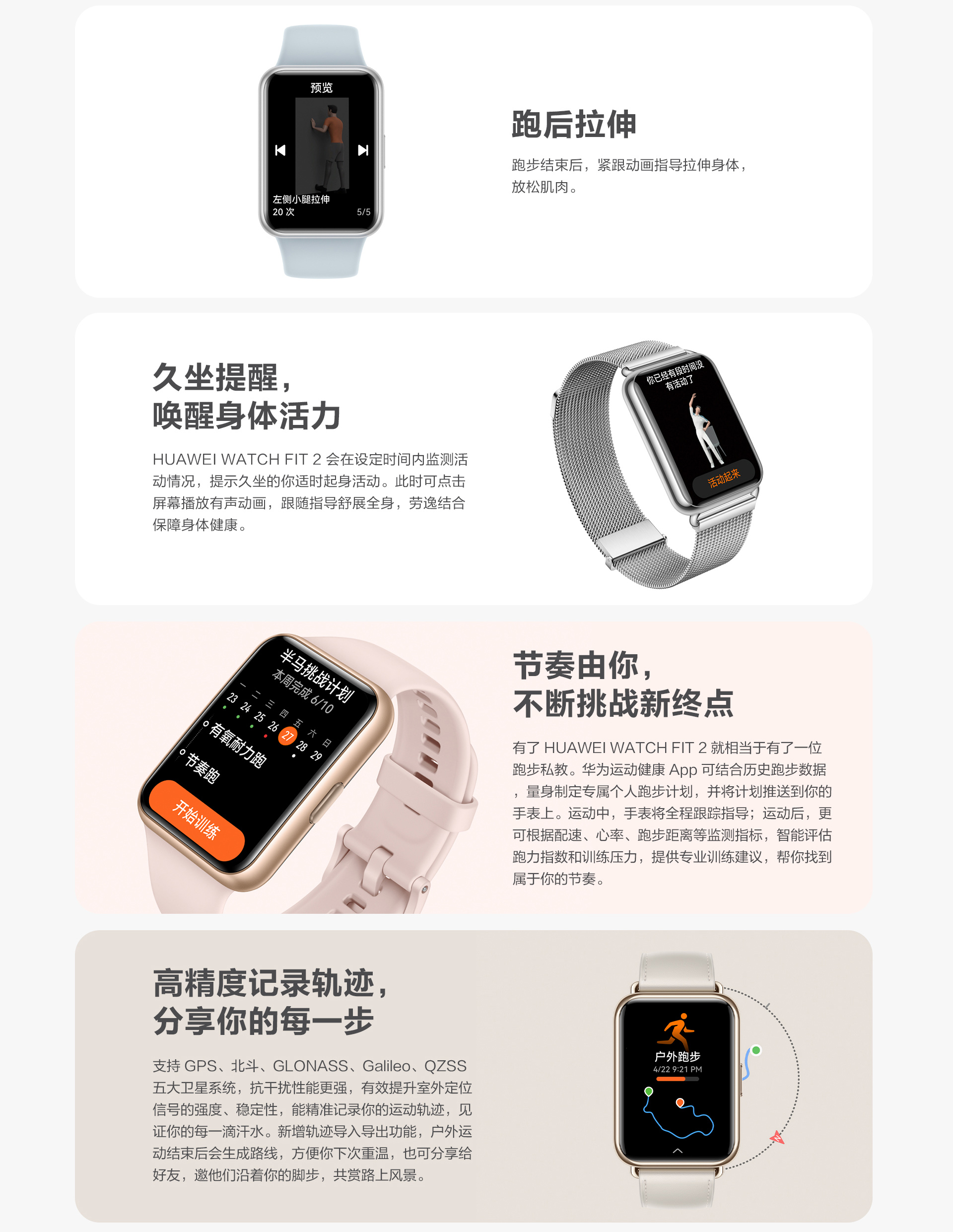 其它功能:支持飛盤、橄欖球、滑板、跳繩等97種運動模式;專屬有聲健身動畫,有聲久坐提醒;個人智能跑步計劃;以跑力指數(shù)為核心的科學運動指導
