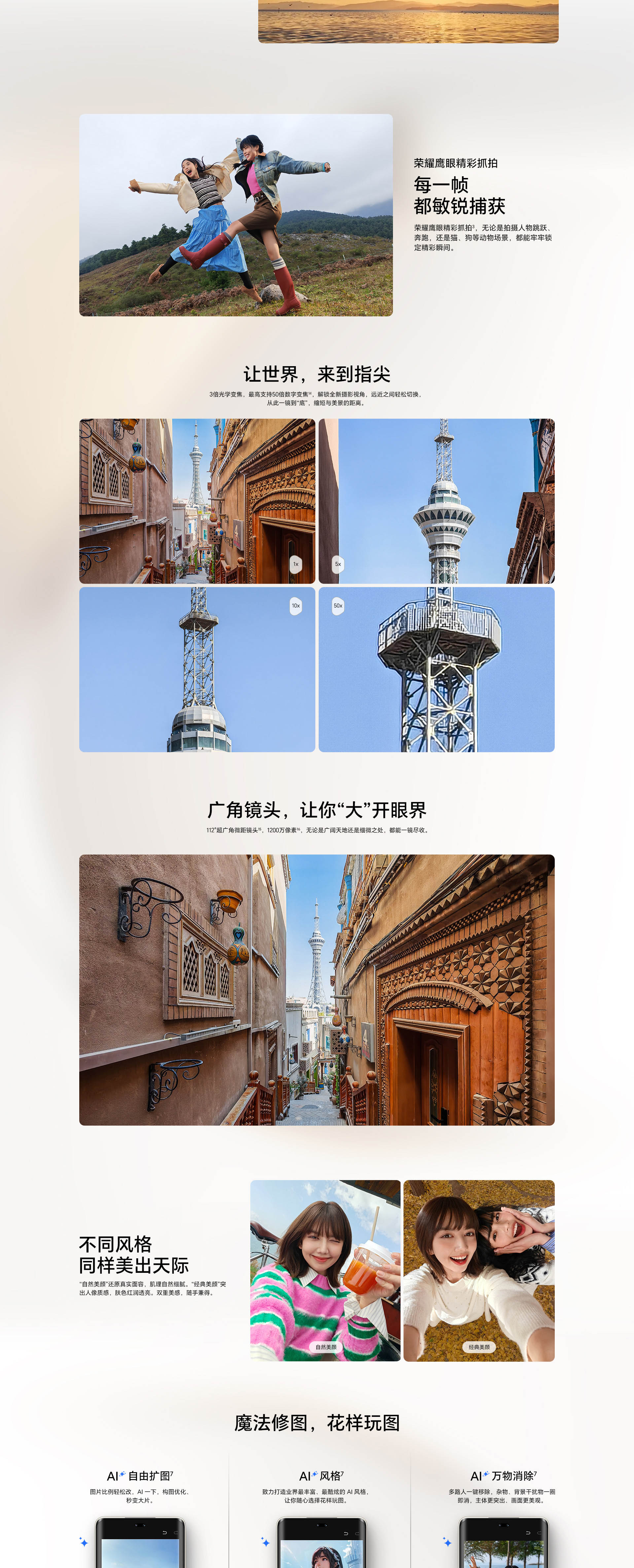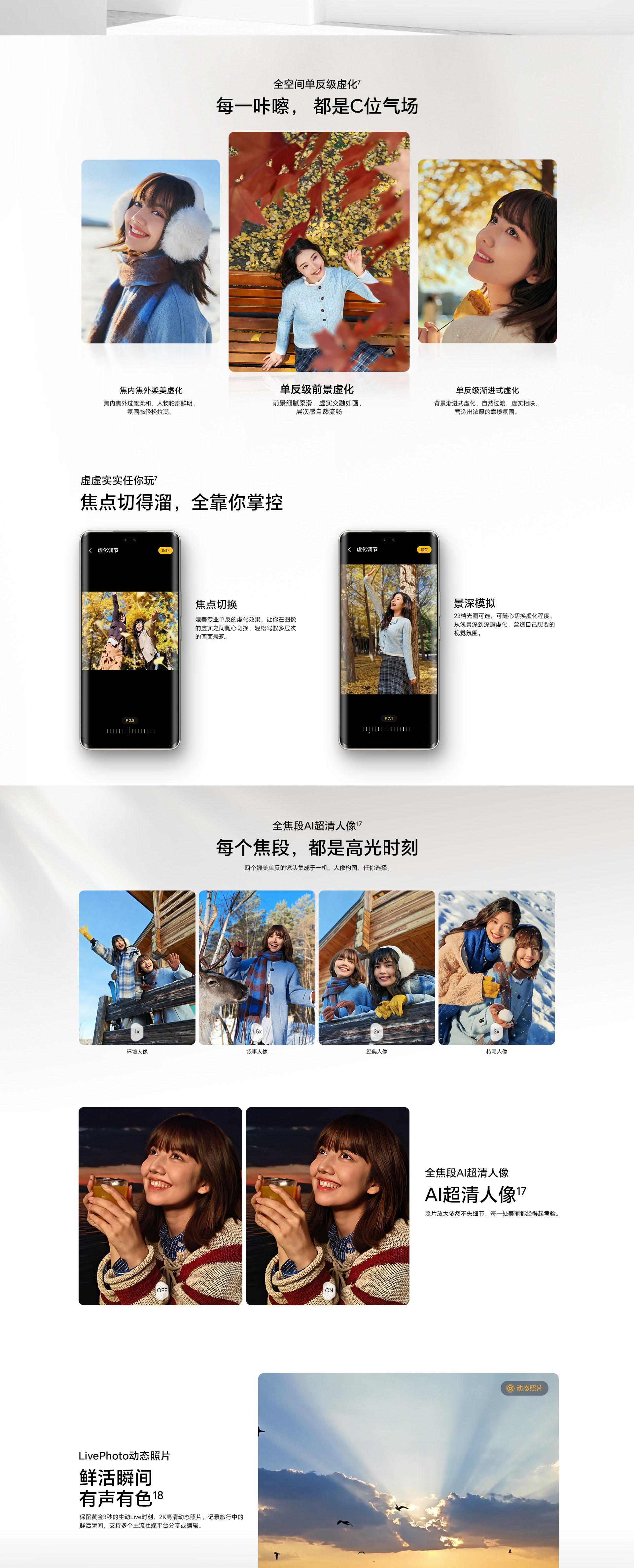 后置拍照功能:最大可支持8192×6144像素,雅顧人像藝術(shù)風(fēng)格、鷹眼精彩抓拍、AI超清人像、動(dòng)態(tài)照片、延時(shí)攝影、AI攝影、超大廣角、大光圈、多鏡錄像、夜景模式、人像模式、專業(yè)拍照、錄像、慢動(dòng)作、全景模式、HDR拍照、夜景錄像、微電影、智能廣角、濾鏡、水印、文檔掃描、超級(jí)微距、笑臉抓拍、聲控拍照、定時(shí)拍攝、連拍、長(zhǎng)焦畫中畫、月亮模式、高像素模式