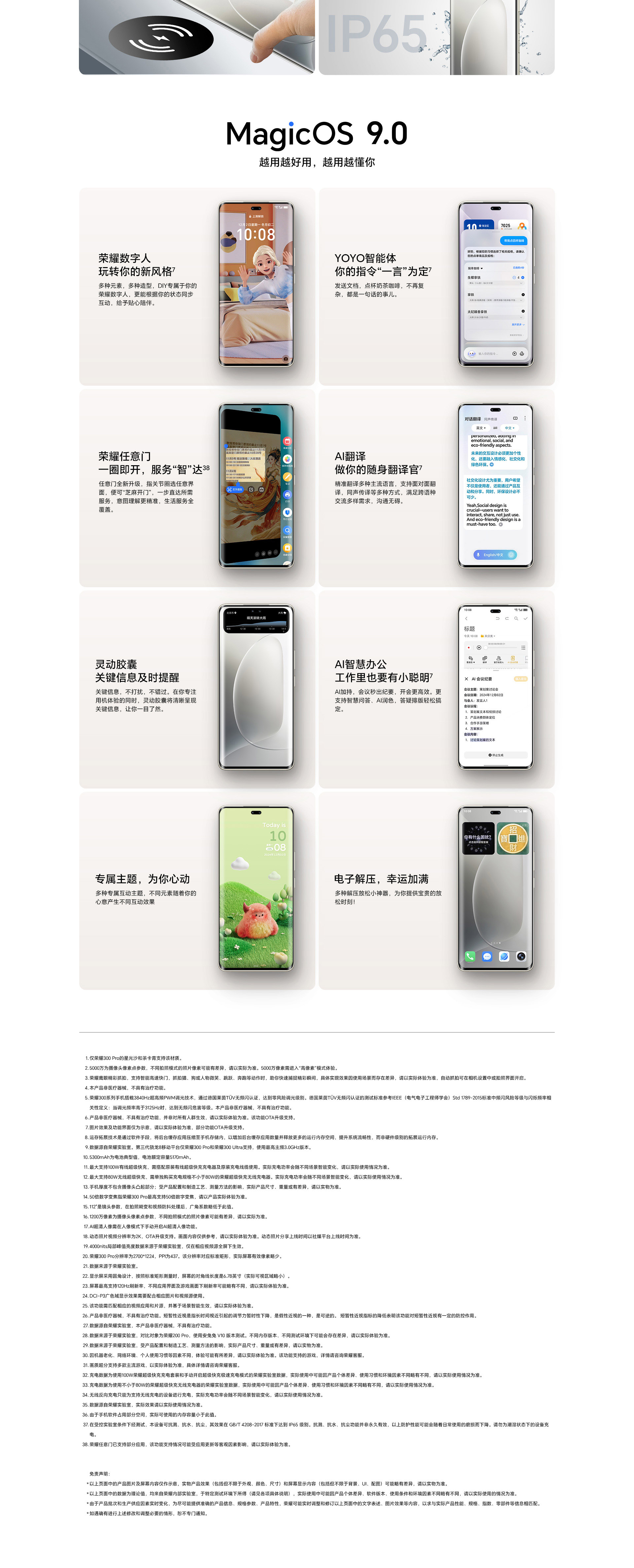 其他功能:YOYO智能體,AI換臉識(shí)別,AI翻譯,魔方個(gè)性化,魔法形象,AI文檔,AI筆記,靈動(dòng)膠囊,魔法鎖屏,榮耀任意門,暈動(dòng)舒緩顯示,全屏熄屏顯示,桌面大文件夾自定義,收藏空間,平行空間,個(gè)人事務(wù)中心,YOYO助理,個(gè)性化鎖屏,反詐防火墻,智慧識(shí)碼,隔空滑動(dòng)屏幕,隔空截屏,智能旋轉(zhuǎn)屏幕和輔助拍照,氣息喚醒,YOYO建議,Magic 文本,OS Turbo X,GPU Turbo X,智慧互聯(lián),智慧運(yùn)存,語(yǔ)音控制呼叫,多屏協(xié)同,電腦模式,智慧視覺(jué),智慧識(shí)屏,全屏翻譯,語(yǔ)音翻譯,AI字幕,智慧多窗,深色模式,電子書模式,純凈文件管理,注視不熄屏,注視來(lái)電音量減弱,榮耀分享,快捷啟動(dòng)及手勢(shì),應(yīng)用分身,換機(jī)克隆,名片掃描,備份與恢復(fù),服務(wù)維修模式
