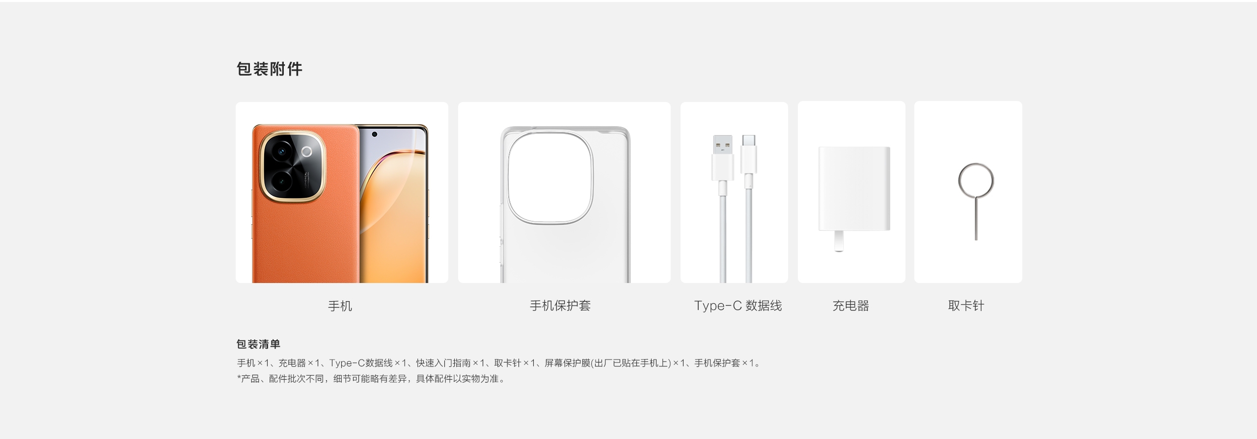 包裝清單:手機 x1 充電頭 x1 Type-C數(shù)據線 x1 保護殼 x1 原裝膜(出廠已貼好) x1 取卡針 x1 快速入門指南 x1