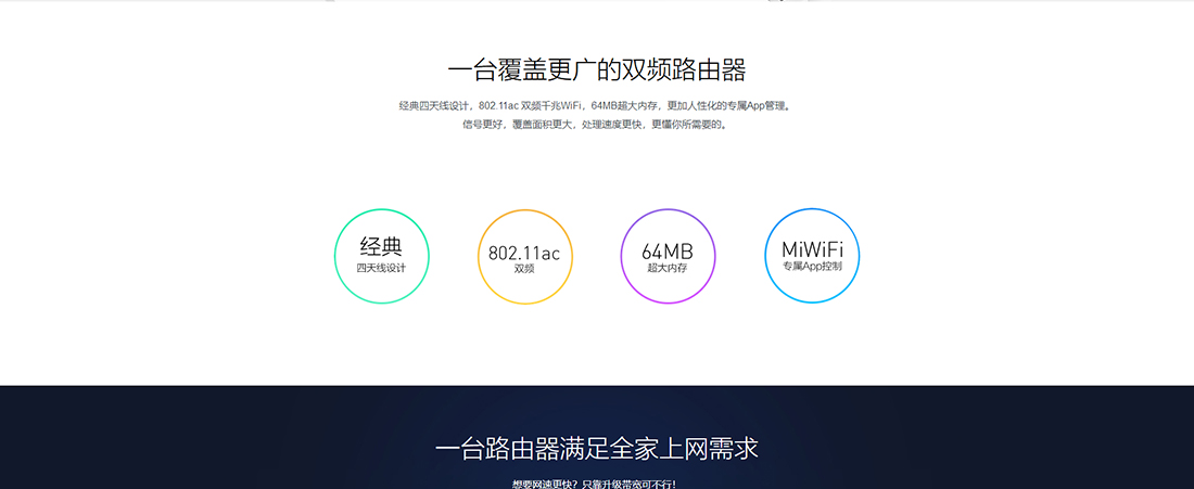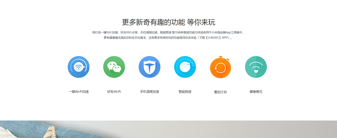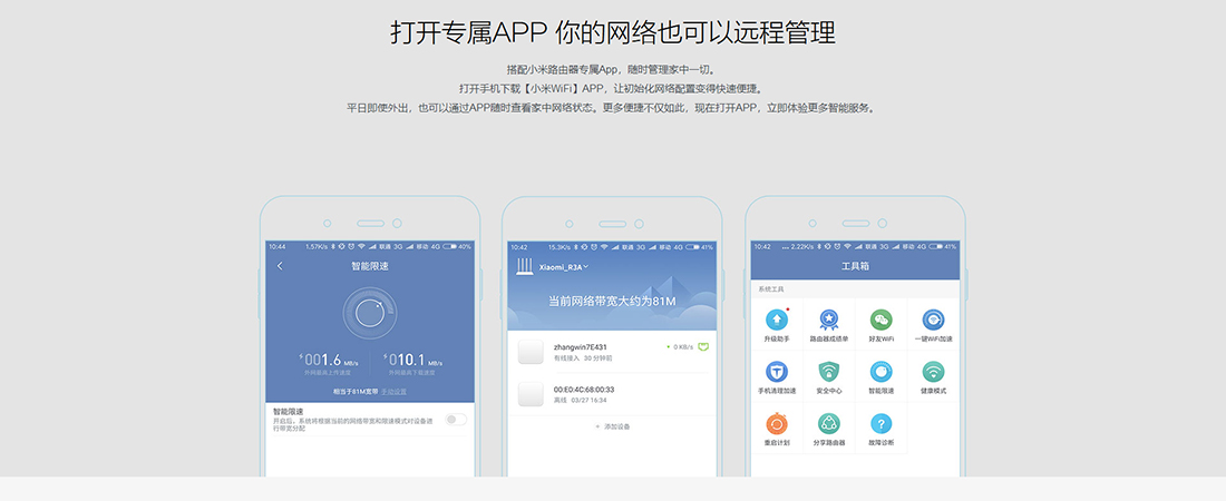 其它性能:智能限速,微信WiFi(好友WiFi),手機(jī)相冊備份,多媒體助手(SAMBA,DLNA,MiTV助手),DDNS,端口轉(zhuǎn)發(fā),定時(shí)開關(guān),健康模式,一鍵WiFi加速,故障診斷