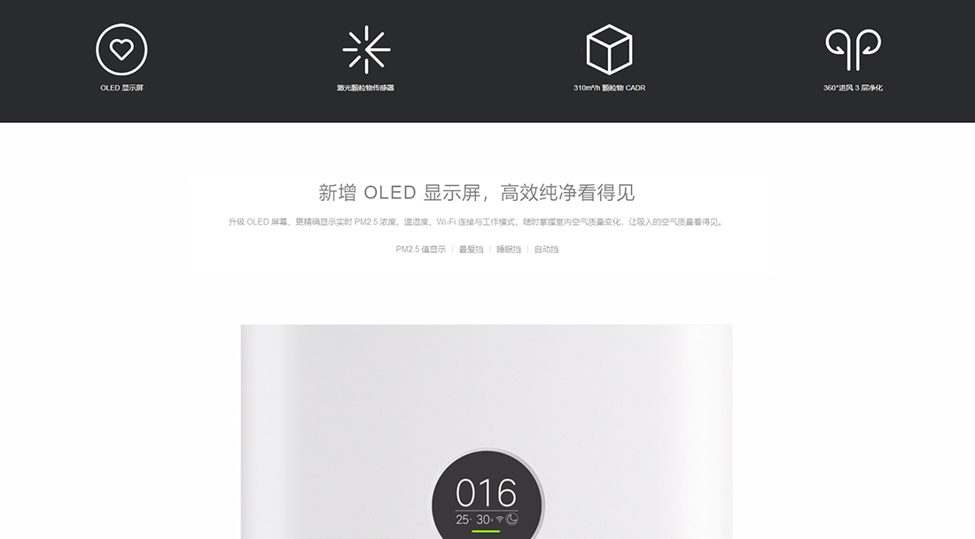 其它功能:顯示實時PM2.5濃度、溫濕度、Wi-Fi;連接與工作模式,隨時掌握室內(nèi)空氣質(zhì)量變化