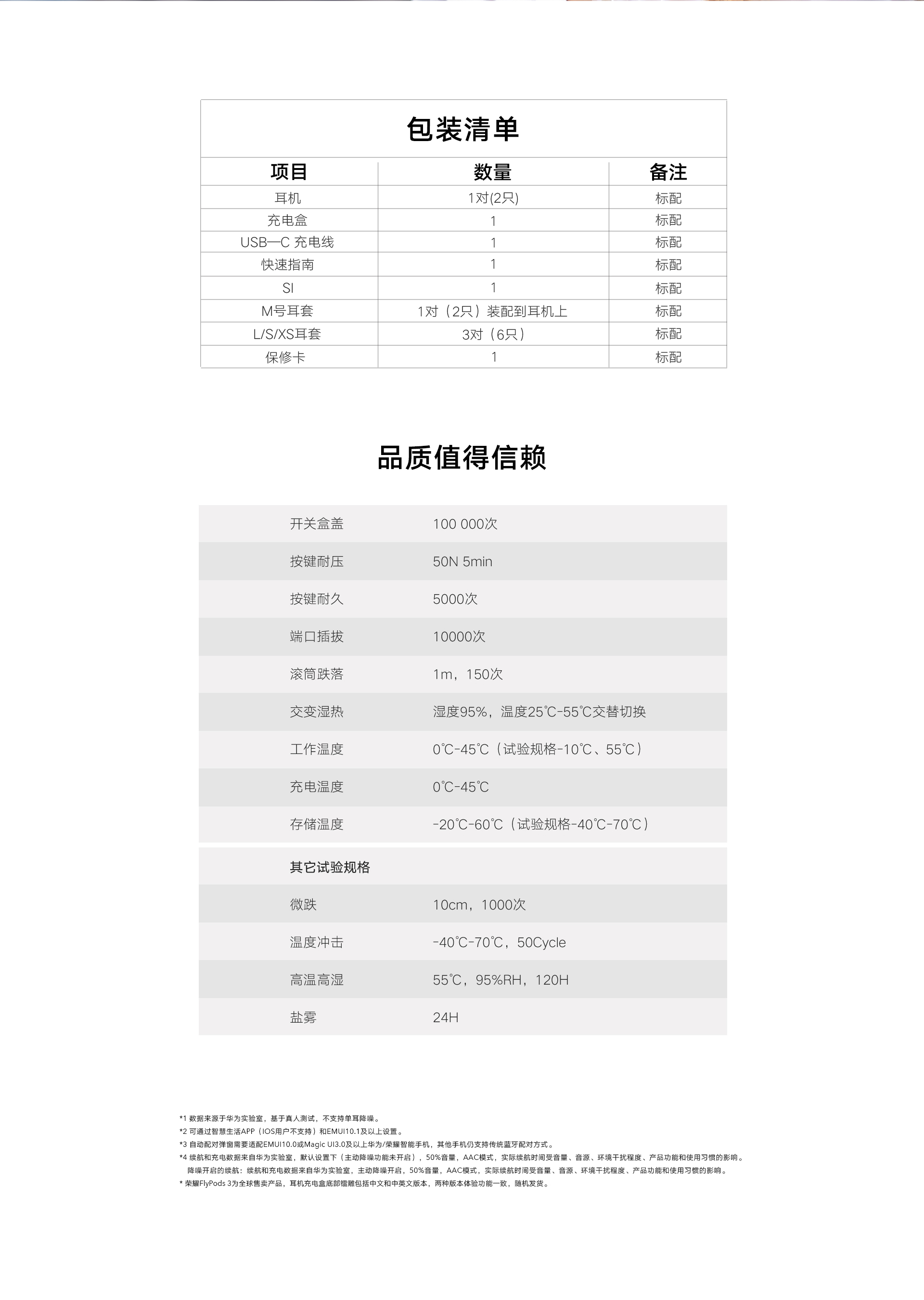 溫度耳機(jī):工作溫度: 0℃~35 ℃ 充電溫度:0℃~45 ℃ 存儲溫度: -20℃~45 ℃ 充電盒:工作溫度: 0℃~35 ℃ 充電溫度:0℃~55 ℃ 存儲溫度: -20℃~45 ℃?zhèn)渥ⅲ簲?shù)據(jù)來自華為實驗室
