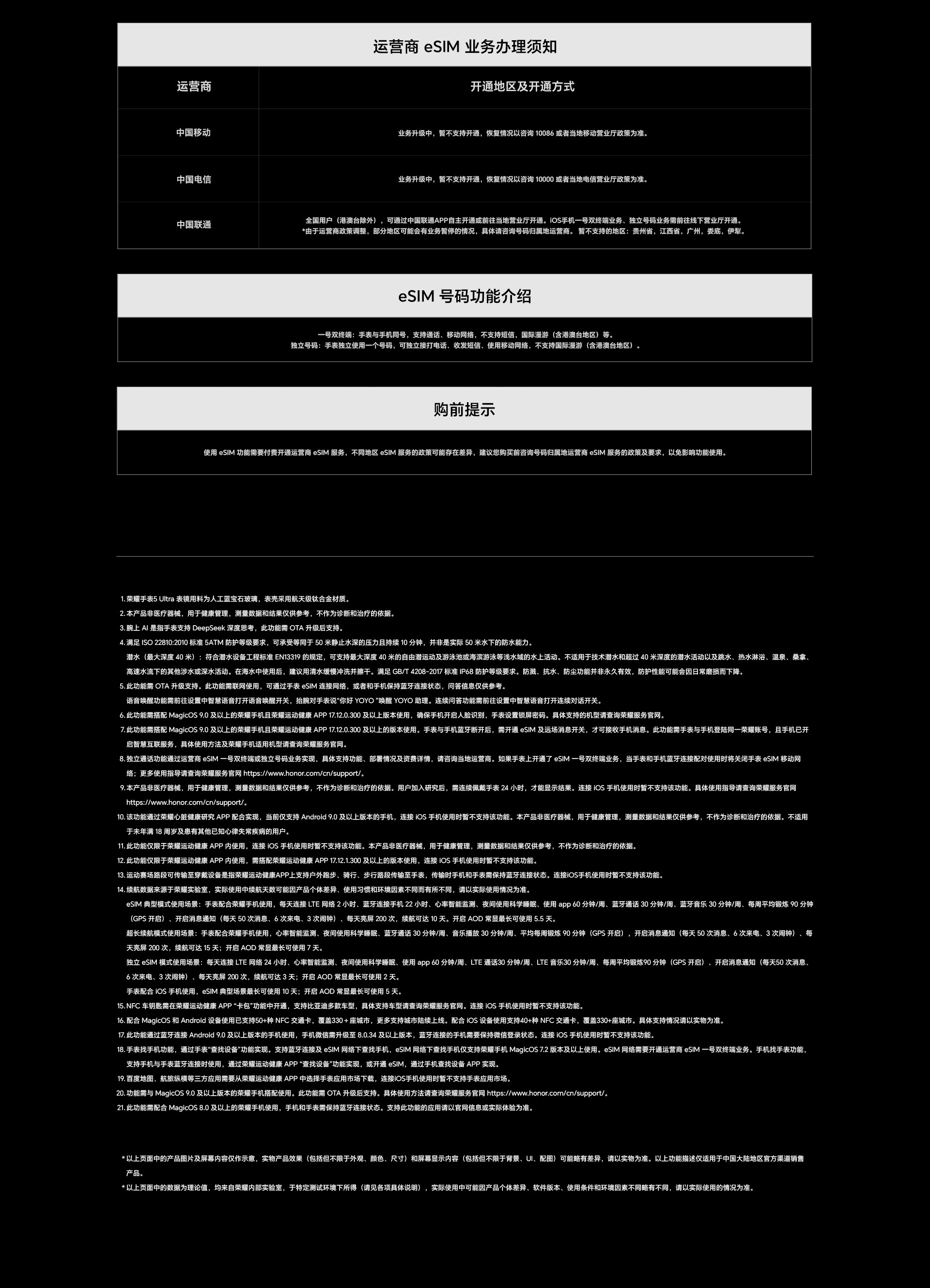 續(xù)航時間:手表配合榮耀手機使用, eSIM典型場景下,續(xù)航可達 10 天;開啟AOD常顯最長可使用5.5天; 全天eSIM典型場景下,續(xù)航可達 3 天;開啟AOD常顯最長可使用2天; 未開通eSIM典型場景下,續(xù)航可達 15 天;開啟AOD常顯最長可使用7天;