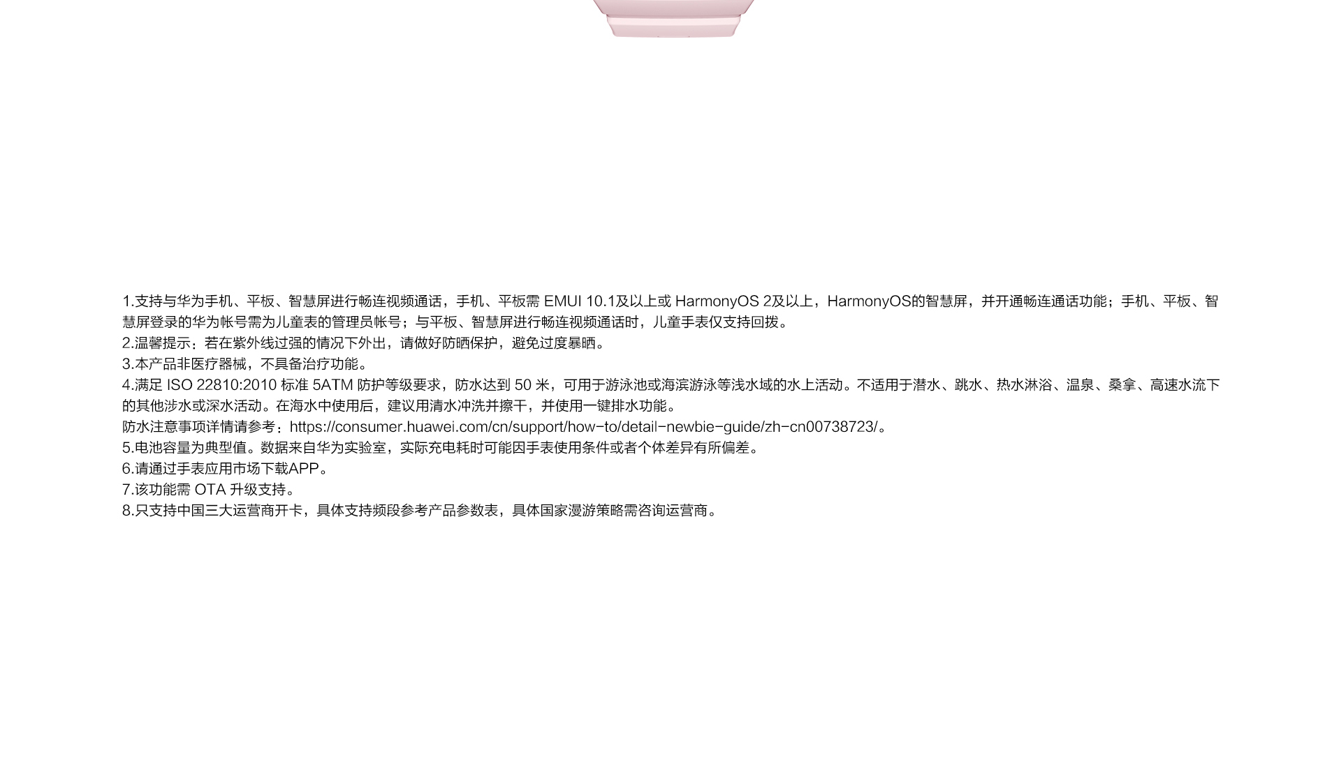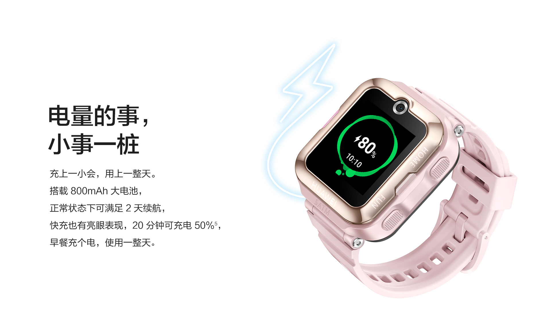 理論工作時(shí)間:典型使用場景下,兩天一充;超級(jí)省電模式下(僅開啟定位和通話功能),七天一充。備注:超級(jí)省電模式是指手表僅開啟通話和定位功能,iOS版本智能關(guān)懷APP暫不支持;典型使用場景是指用戶通話時(shí)長和使用次數(shù)等在正常使用場景下;同時(shí),需使用出廠默認(rèn)配置,開啟上課禁用及定時(shí)開關(guān)機(jī)功能。續(xù)航數(shù)據(jù)來自華為實(shí)驗(yàn)室,實(shí)際續(xù)航時(shí)長與使用習(xí)慣、網(wǎng)絡(luò)環(huán)境、使用頻率相關(guān),不同用戶有所不同。