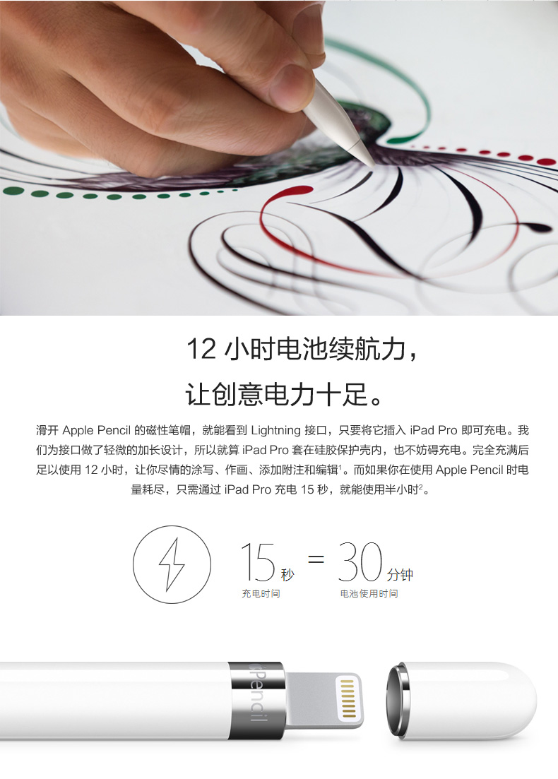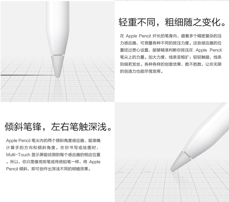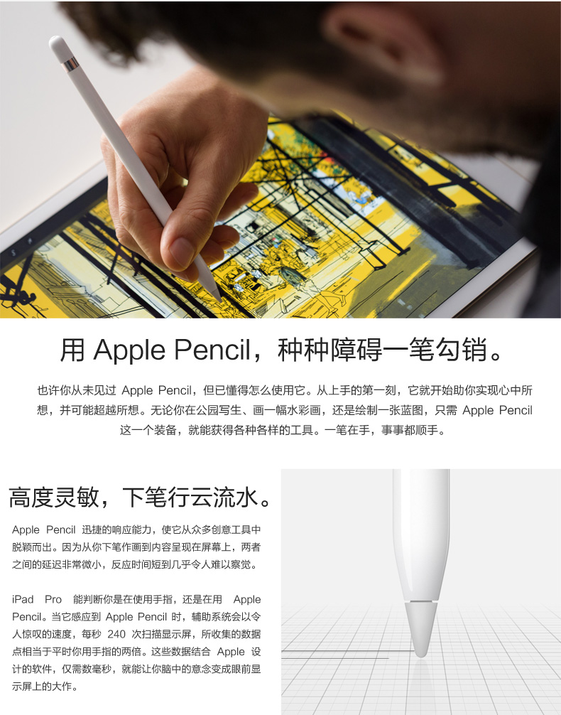 Apple Pencil 拓展了 iPad mini、iPad Air 和 iPad 的強大功能,為你開辟出一片嶄新的創(chuàng)意天地。它能靈敏地感應(yīng)到用筆力度和運筆角度的變化,從而讓你輕松改變線條粗細,創(chuàng)造微妙的陰影,設(shè)計出多種藝術(shù)效果。一切就像使用傳統(tǒng)鉛筆一樣自然,但又能達到像素級別的精準度。