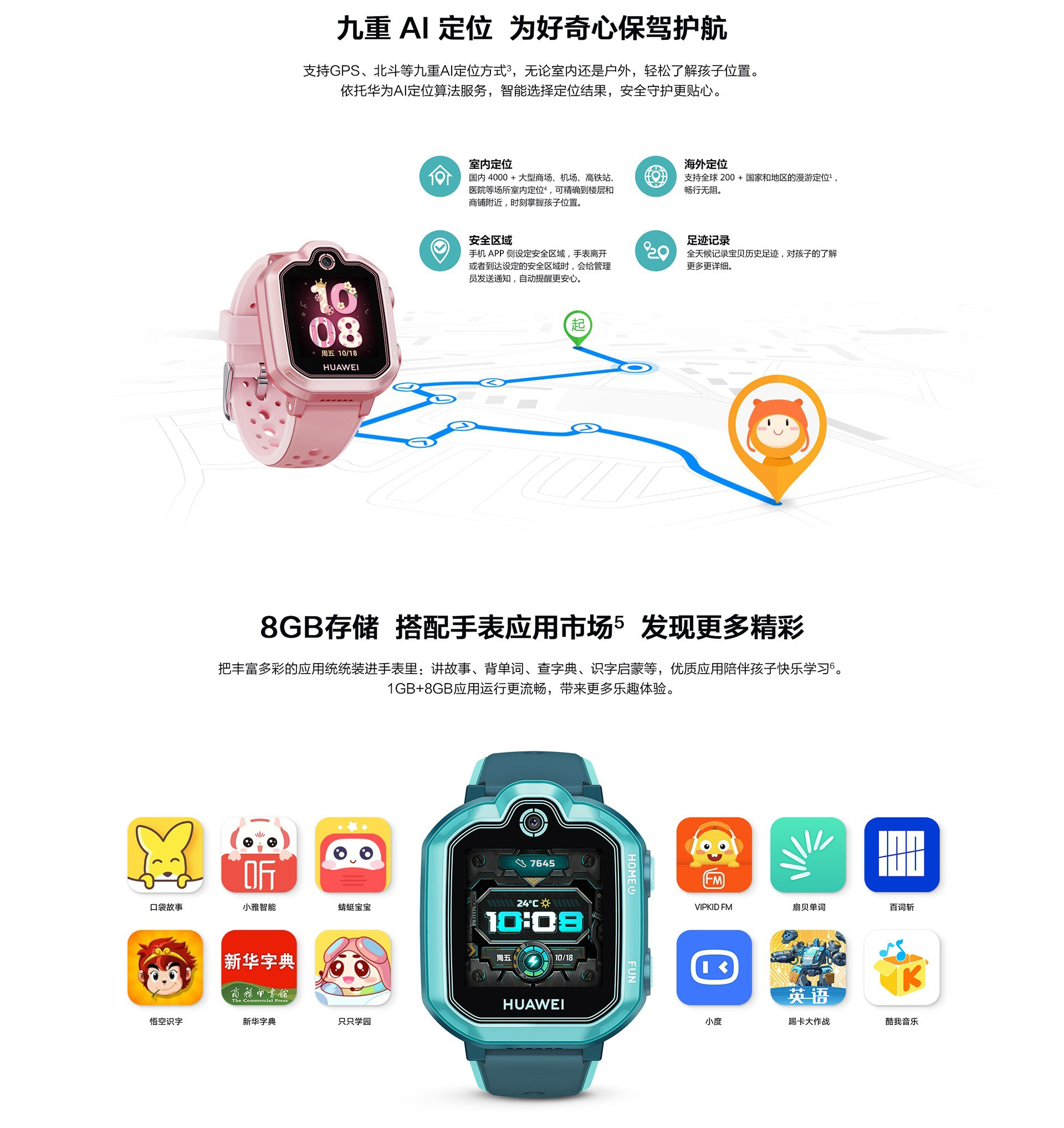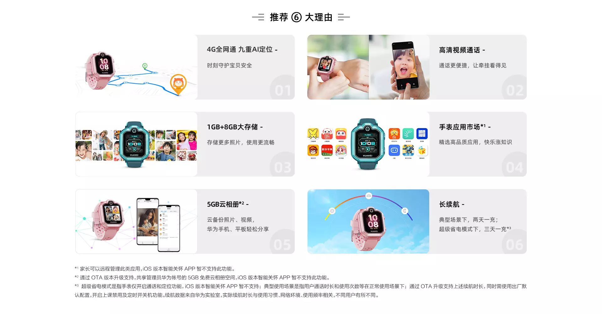 4G全網(wǎng)通 / 高清視頻通話 / 大存儲 / 云相冊 / 長續(xù)航 / 智能兒童手表