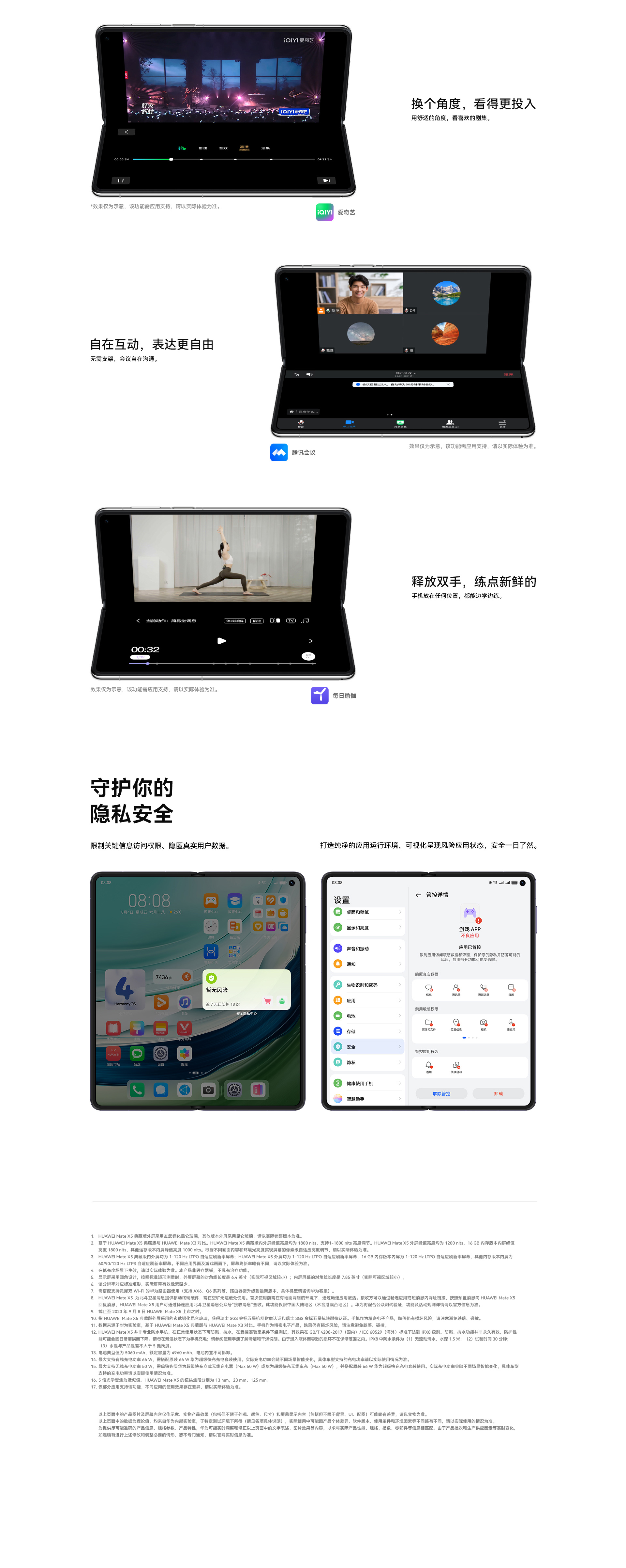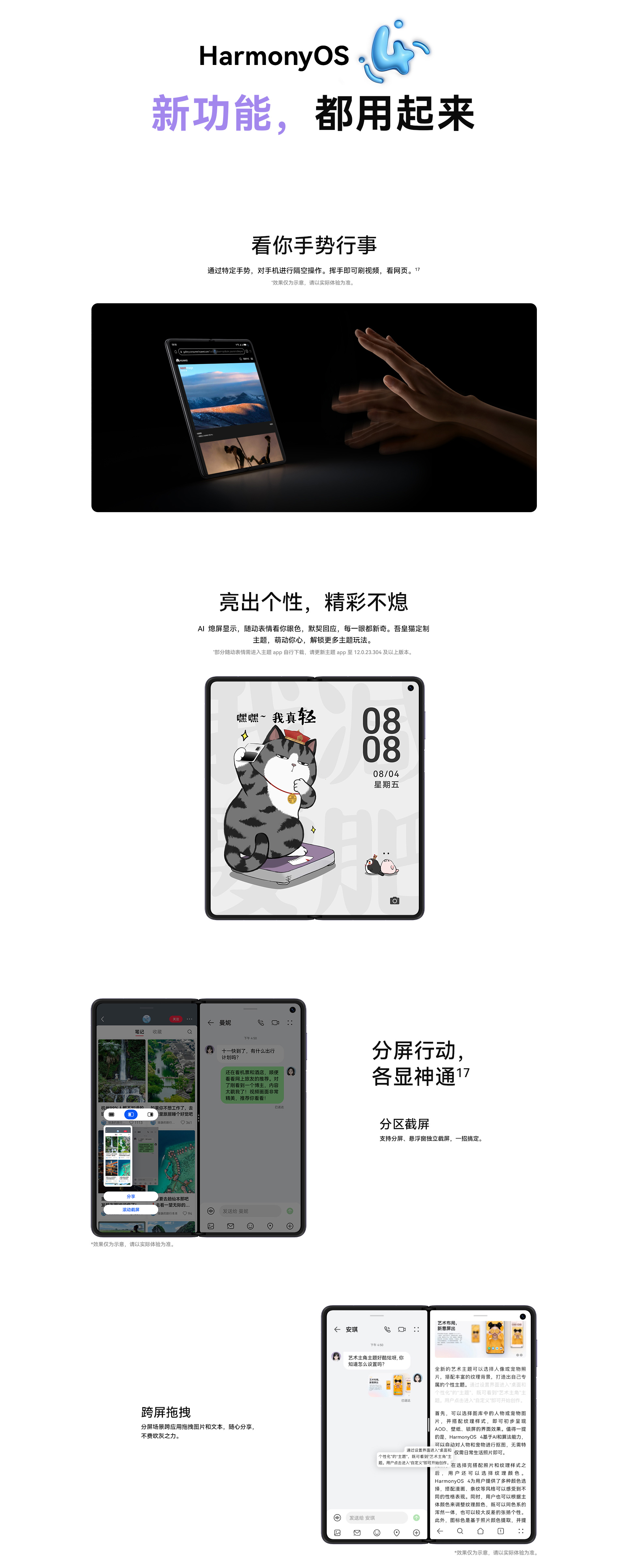 其他功能:雙向北斗衛(wèi)星消息*、隨動表情、AI隔空操控、相機百寶箱、自適應(yīng)UI引擎、3D動態(tài)天氣熄屏顯示、上下/左右分屏、智慧多窗、超級夜景、超級微距、微距視頻、視頻HDR Vivid、微電影、小藝智慧語音、靈動熄屏顯示、中轉(zhuǎn)站、智感支付、低電量應(yīng)急模式、超空間存儲壓縮、萬能卡片、大文件夾、口罩人臉識別、超級終端、音頻分享、AI字幕、跨設(shè)備剪貼板、隱私中心、超級隱私模式、安全中心、純凈模式、多機位、暢連通話、分布式通信、暢連大文件閃傳、多屏協(xié)同、智能截屏、智慧視覺、華為分享、華為打印、無線投屏、應(yīng)用分身、密碼保險箱