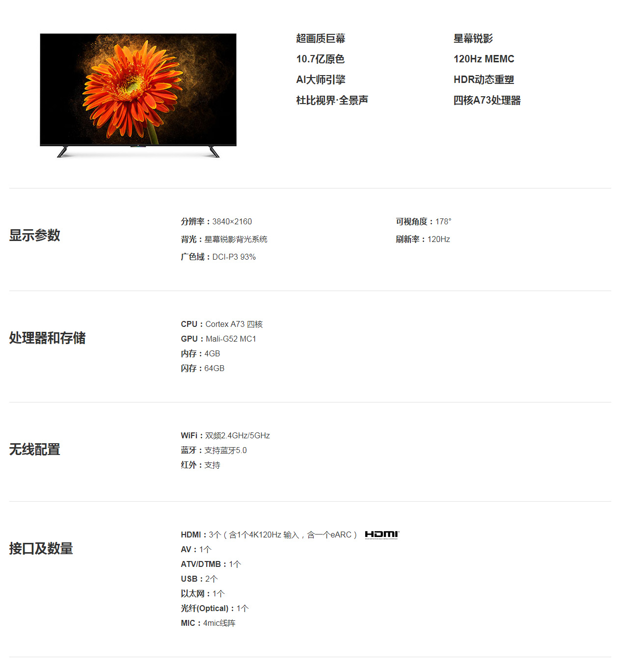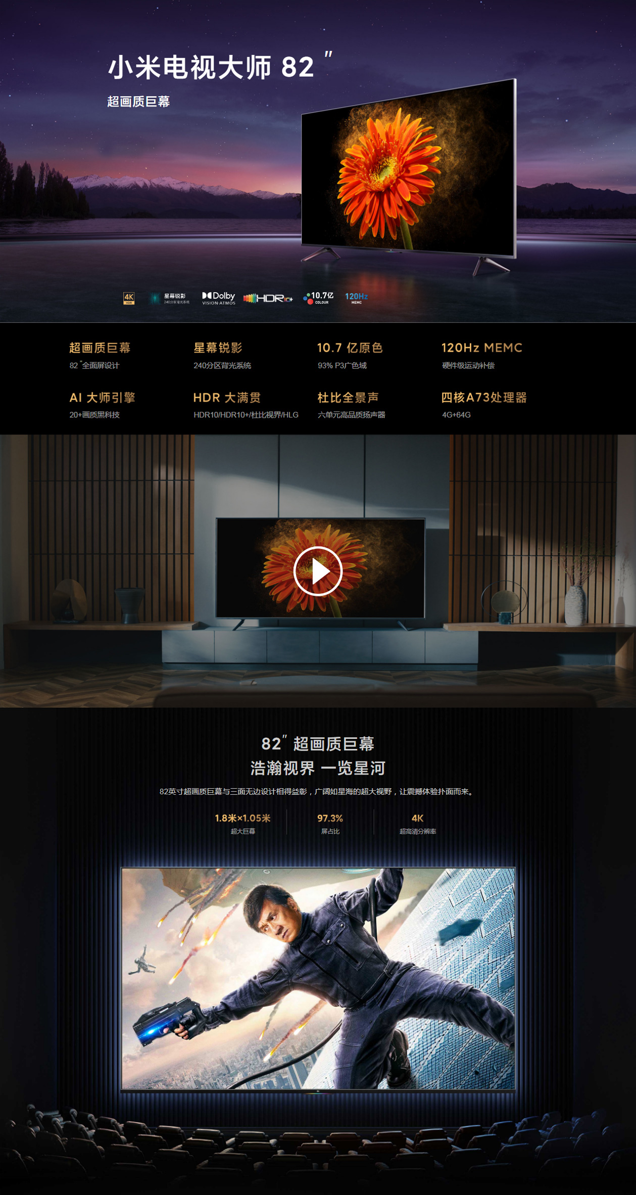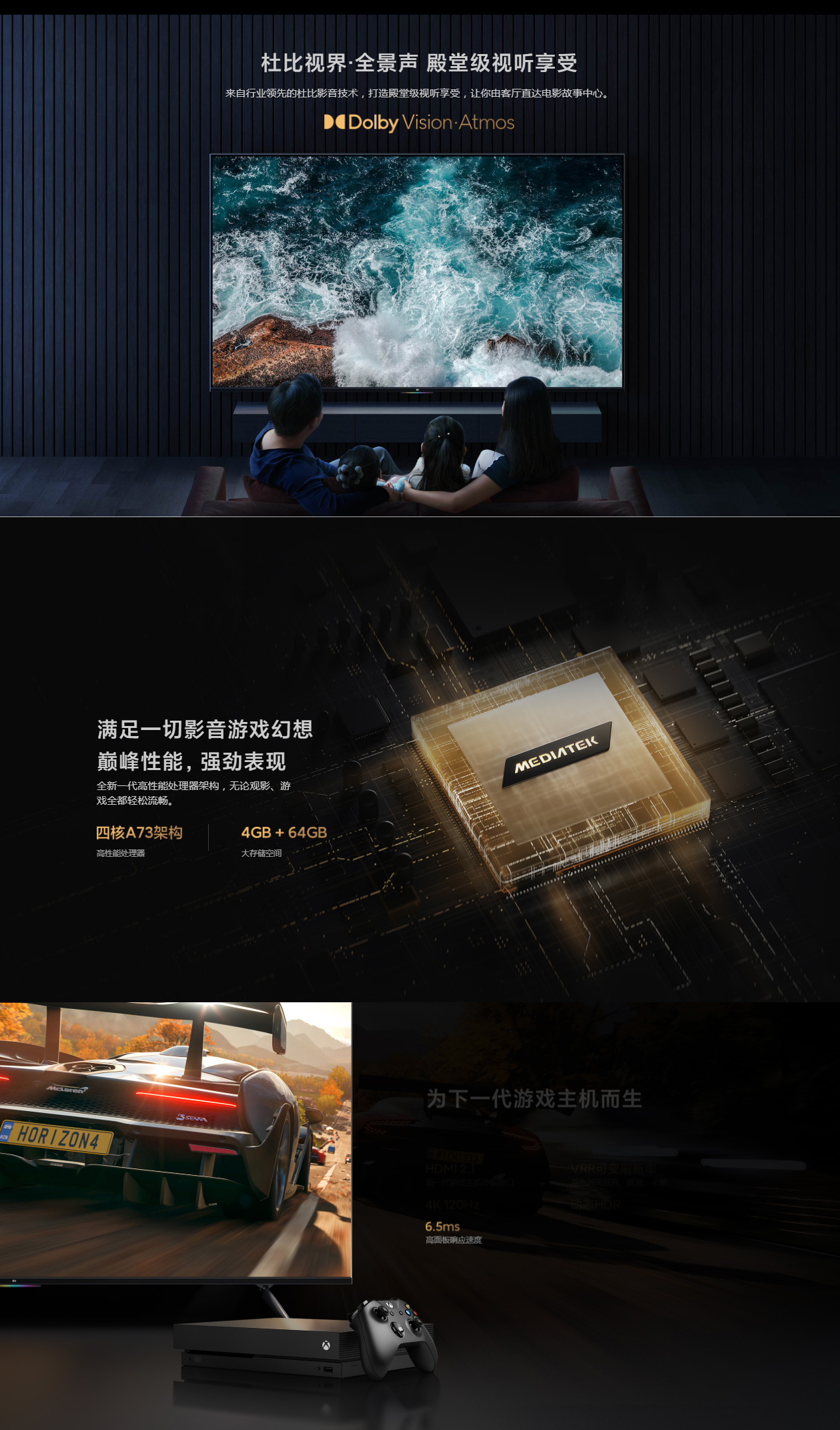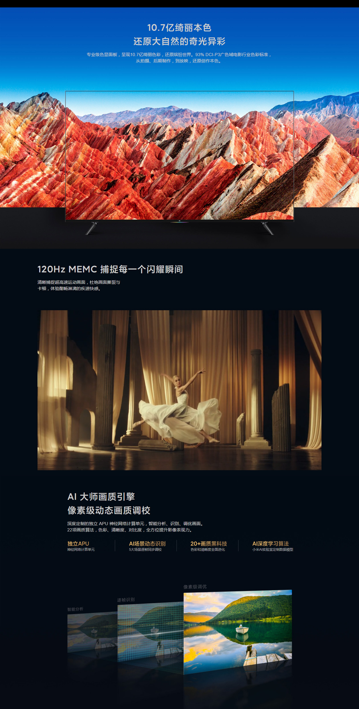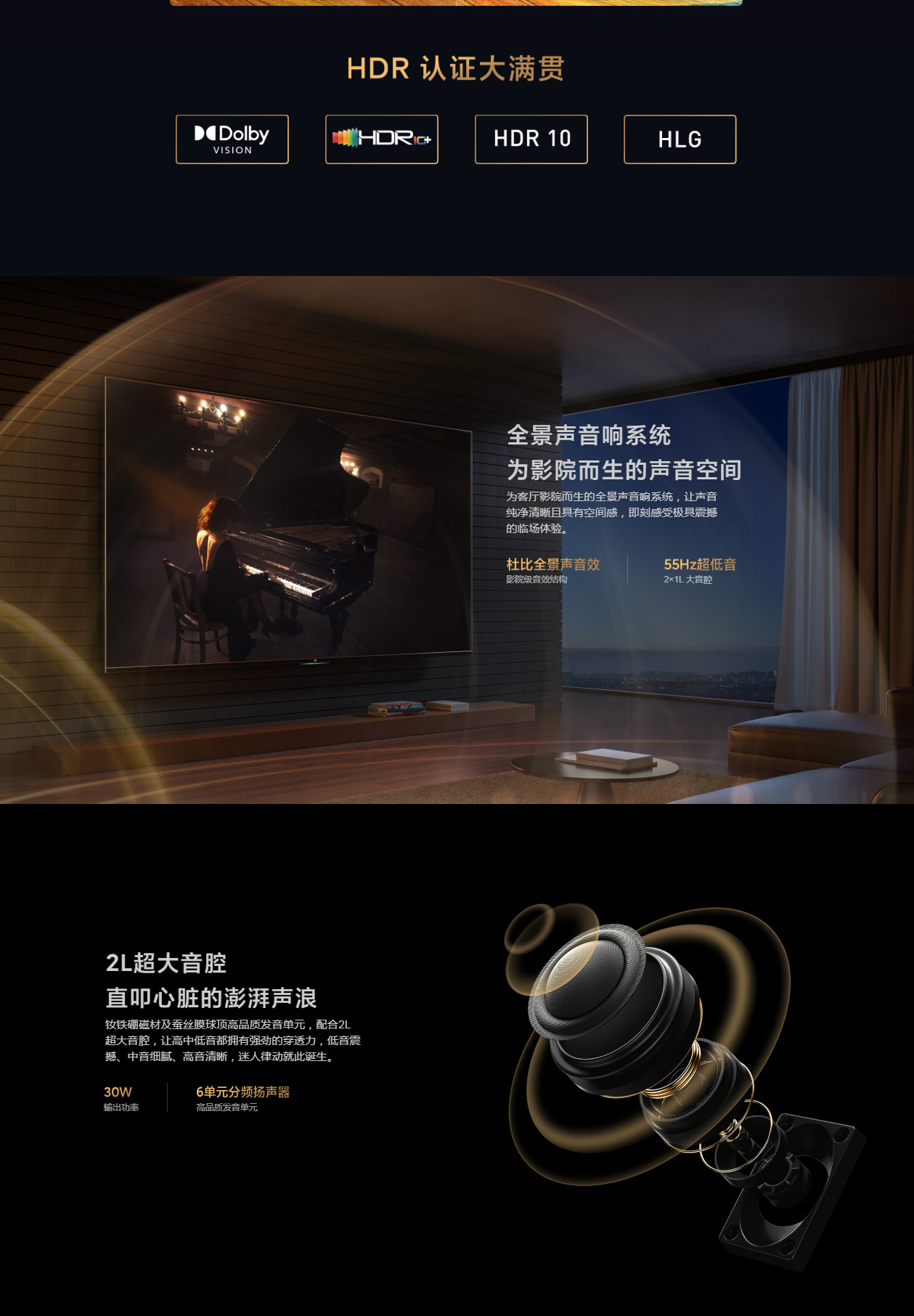 超畫質(zhì)巨幕 / 星幕銳影 / 10.7億原色 / 120Hz MEMC / AI大師引擎 / HDR大滿貫 / 杜比全景聲 / 四核A73處理器