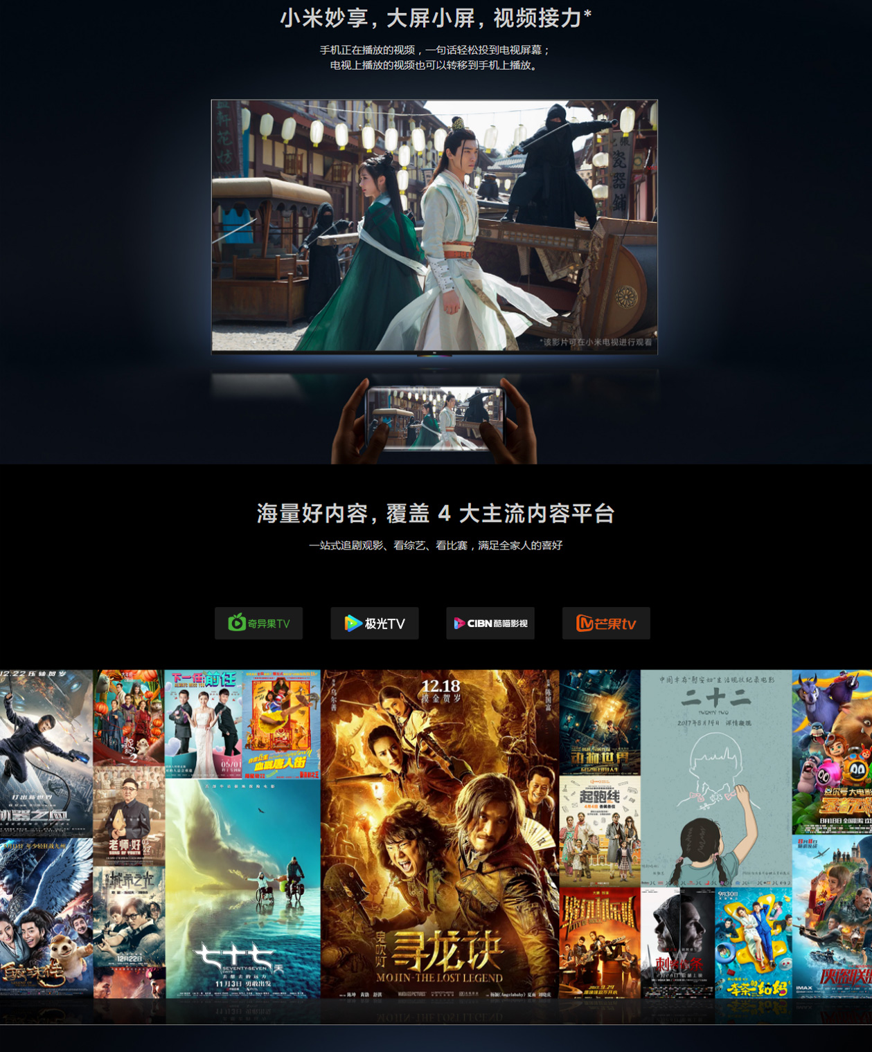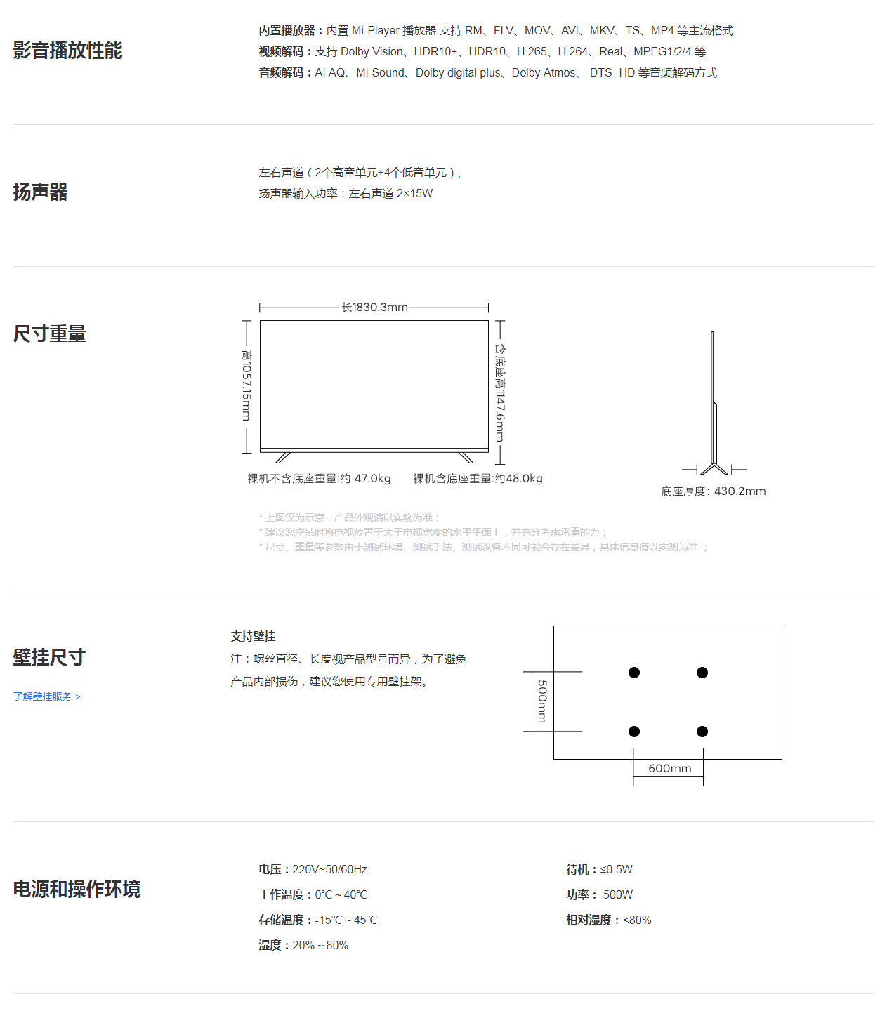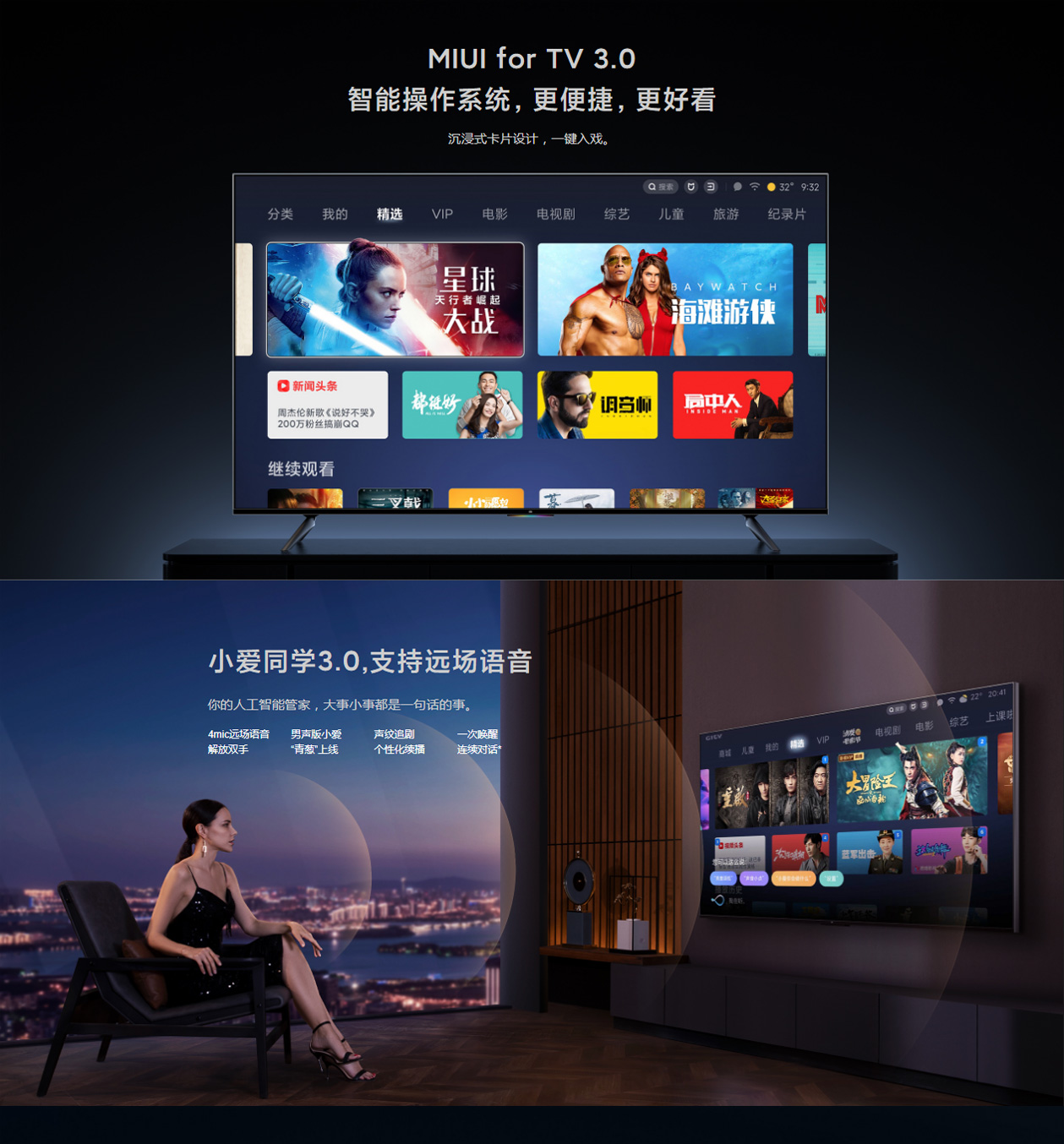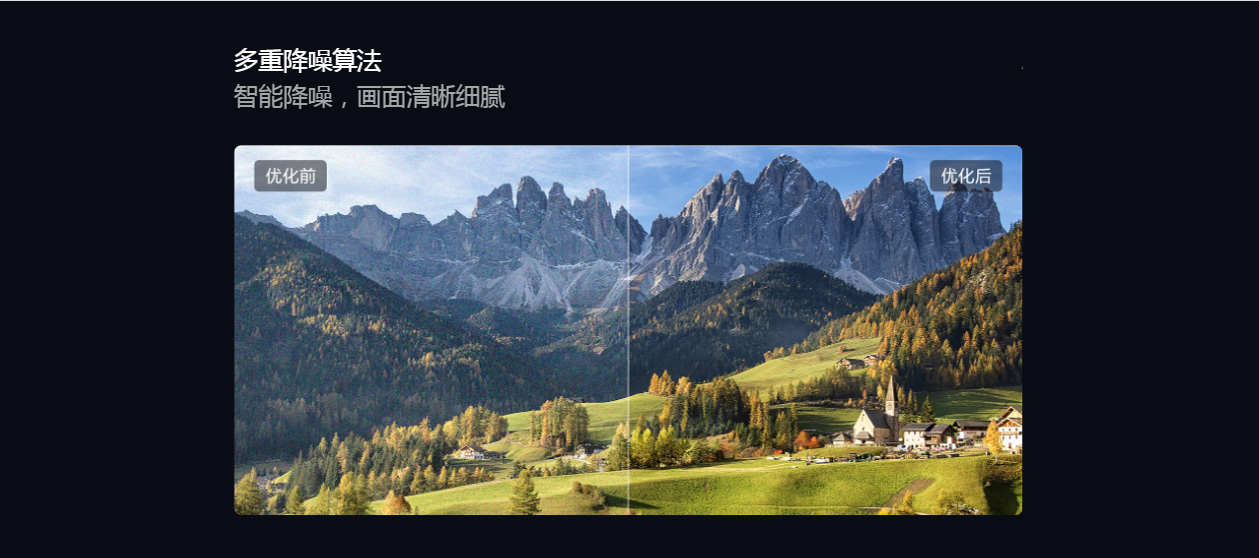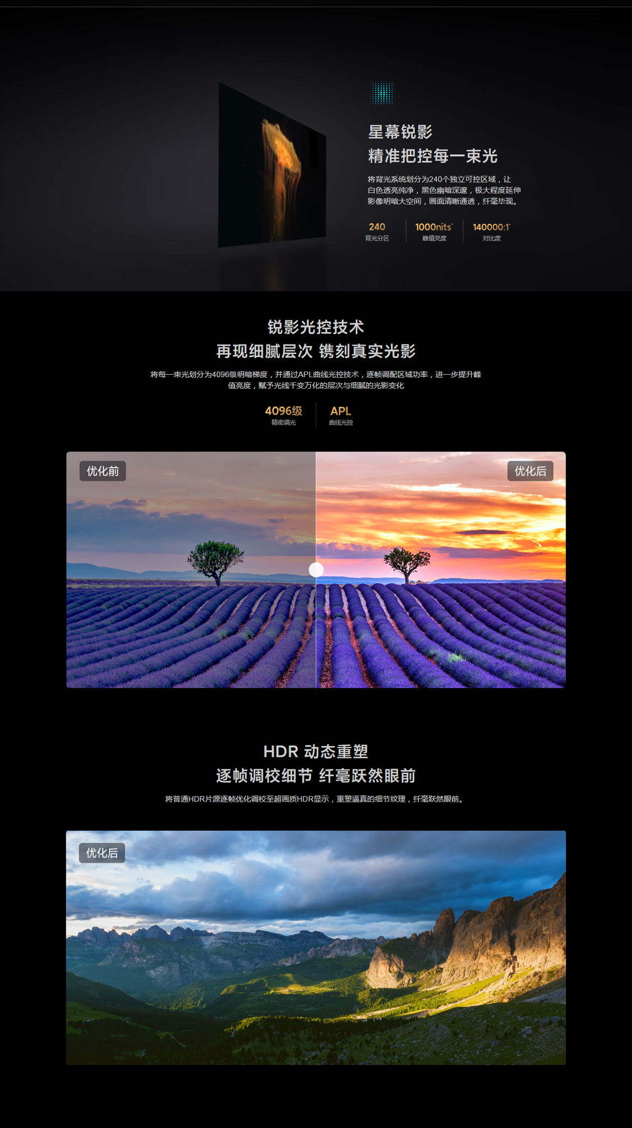 超畫質(zhì)巨幕 / 星幕銳影 / 10.7億原色 / 120Hz MEMC / AI大師引擎 / HDR大滿貫 / 杜比全景聲 / 四核A73處理器
