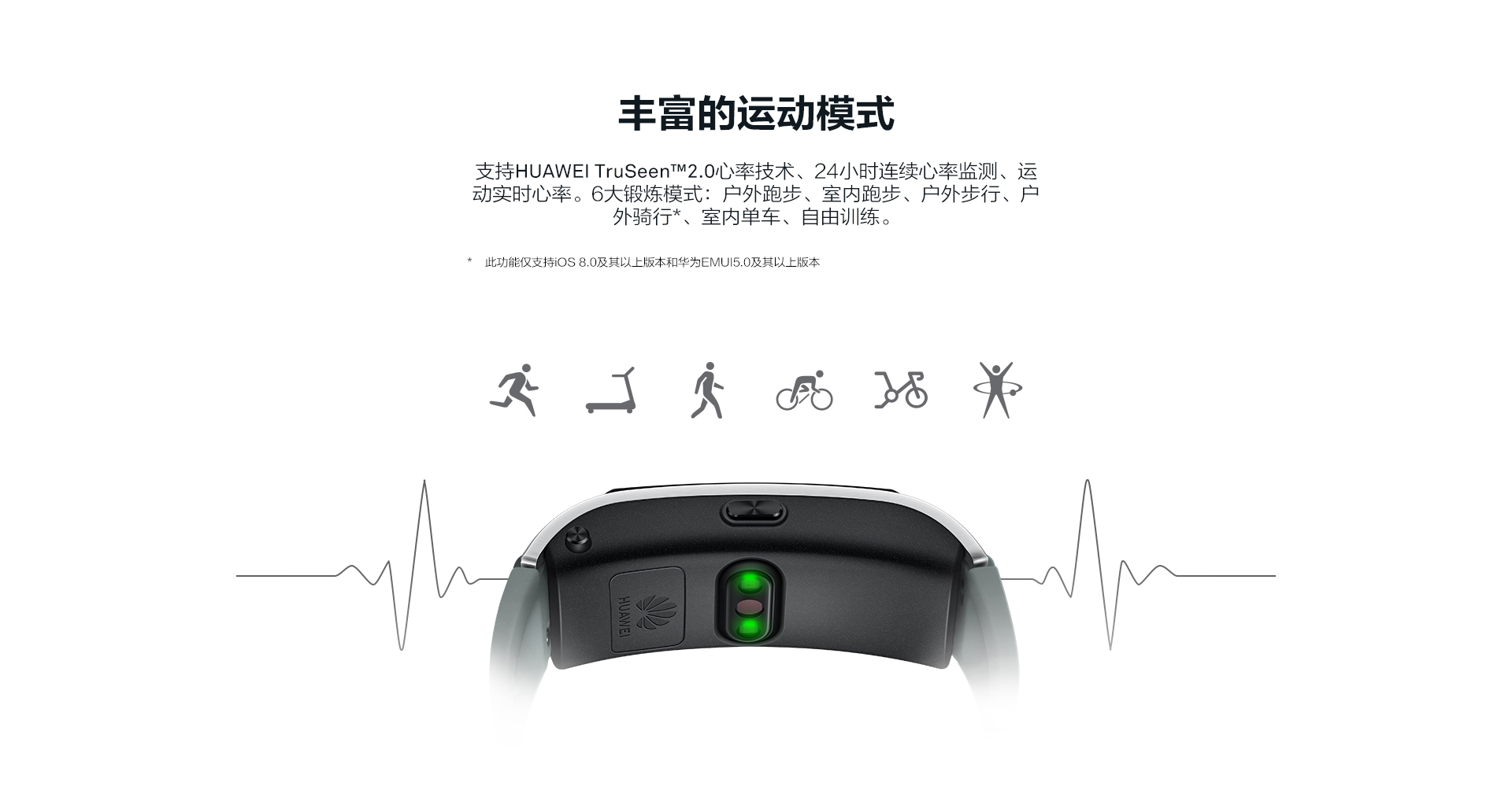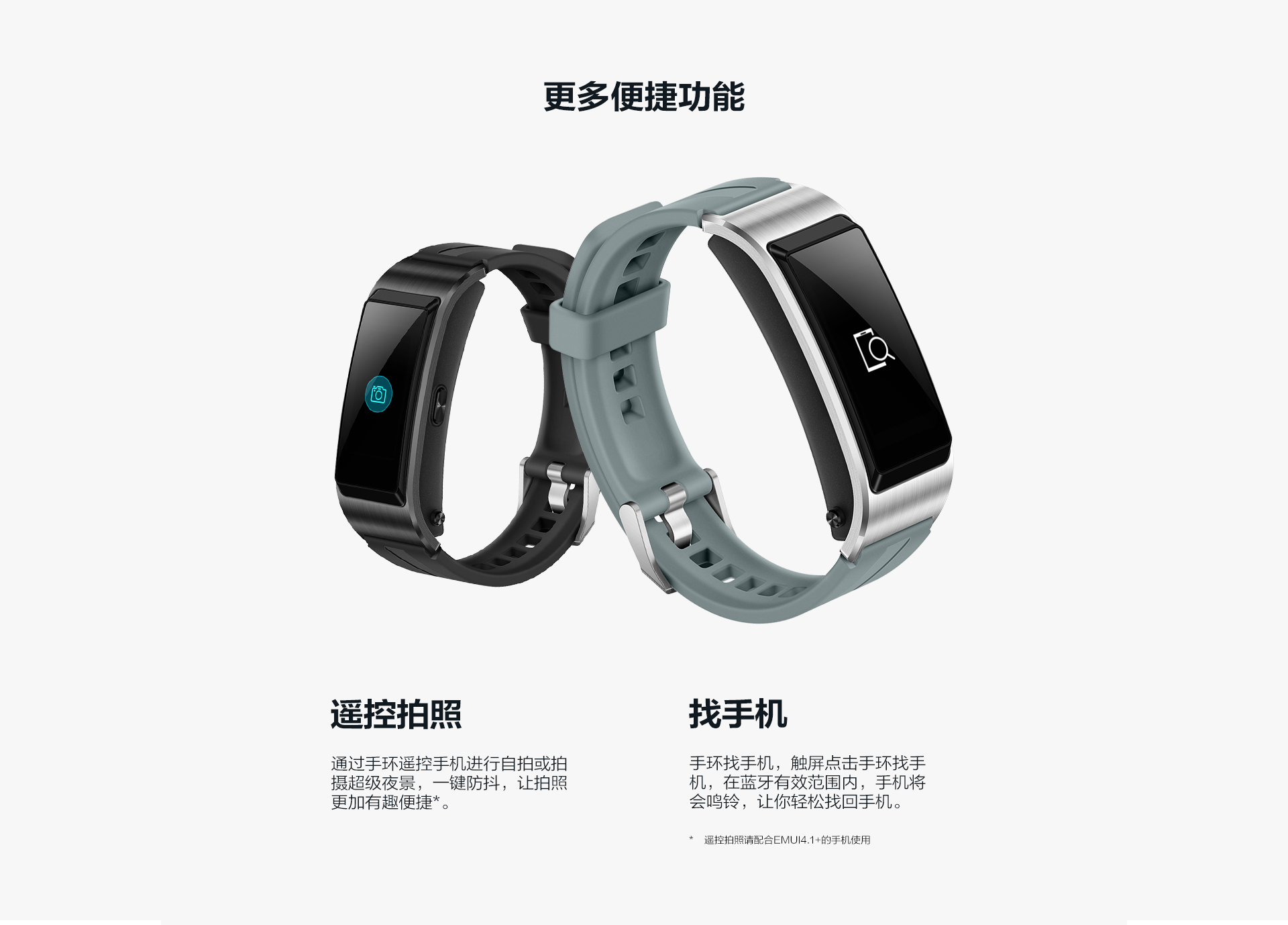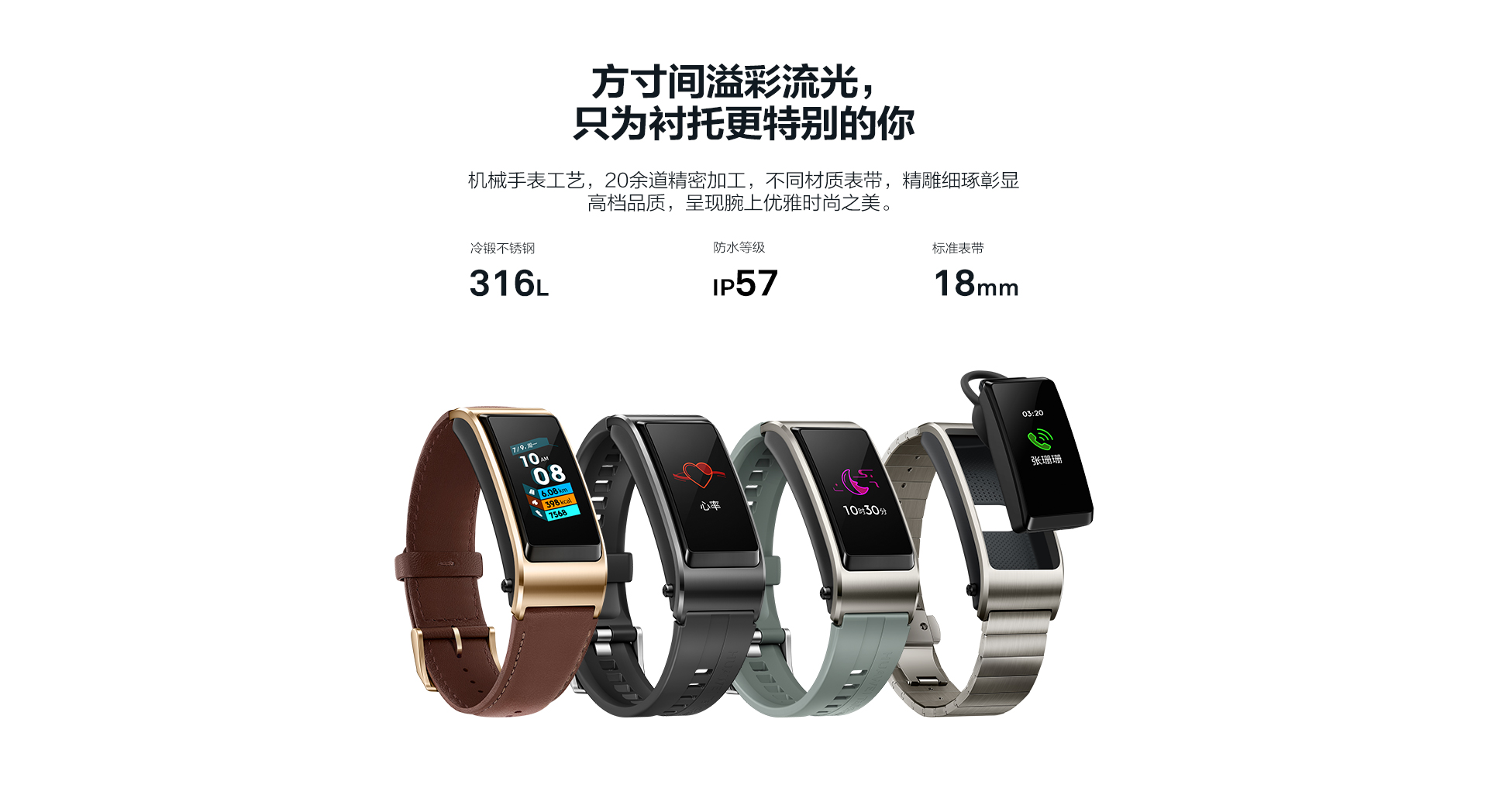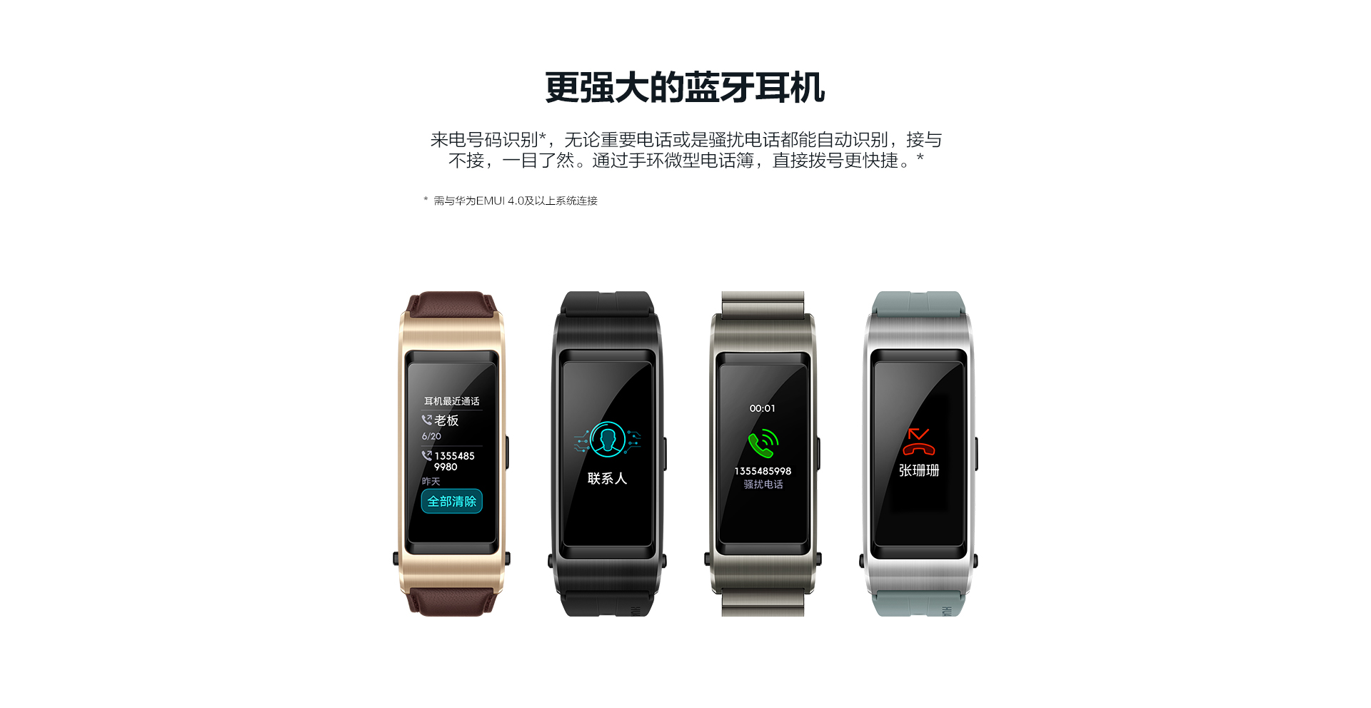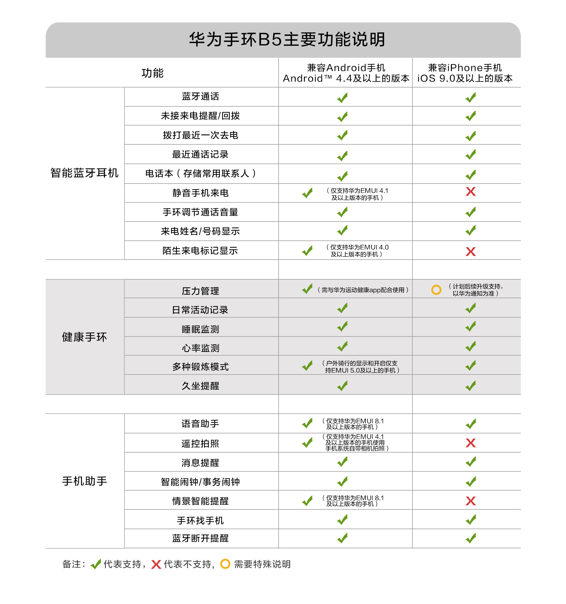 特性功能:彩屏觸控,藍(lán)牙通話,通過(guò)藍(lán)牙耳機(jī)聽(tīng)音樂(lè),來(lái)電識(shí)別,聯(lián)系人(快速撥號(hào)),來(lái)電靜音(僅支持華為EMUI 4.1及以上版本的手機(jī)),通話記錄,健康助手(TruSleep科學(xué)睡眠、24小時(shí)心率監(jiān)測(cè)、活動(dòng)記錄等),運(yùn)動(dòng)監(jiān)測(cè)(走路、跑步,騎行等多種鍛煉模式監(jiān)測(cè)),運(yùn)動(dòng)目標(biāo)設(shè)定,消息提醒,久坐提醒,智能鬧鐘,事務(wù)鬧鐘,手環(huán)找手機(jī)