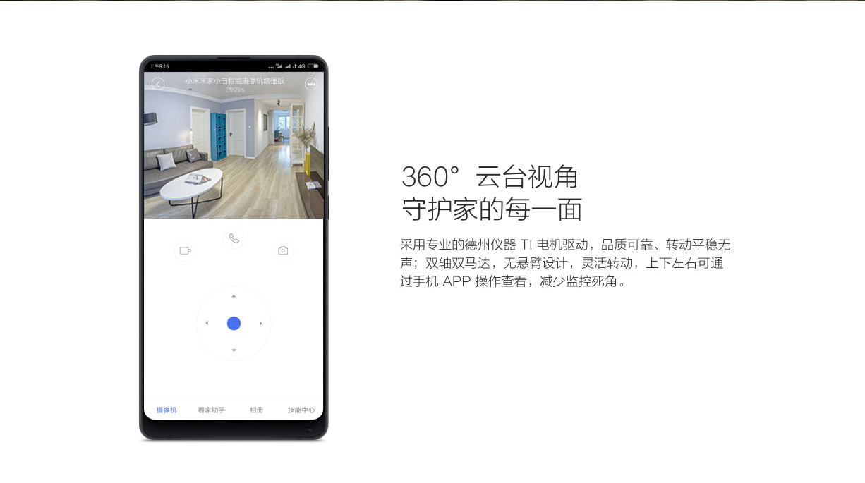360度全景:采用雙軸雙馬達,無懸臂設(shè)計,使它擁有如人體脖子一般的靈活性,85度垂直絕對視角,家中任何角落都可一覽無余