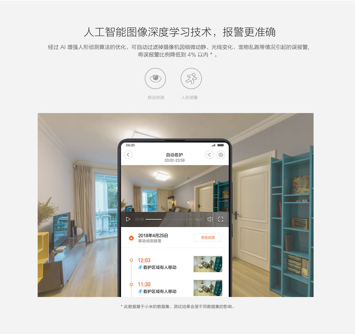 多角度智能看管:開啟智能看家,設(shè)定看護時間,移動偵測立即啟動,當(dāng)偵測區(qū)域內(nèi)有物體移動變化時,即可啟動警報并錄制10秒,云視頻推送至手機,及時關(guān)注家人及寵物的實時動態(tài),不必?fù)?dān)心危險的發(fā)生