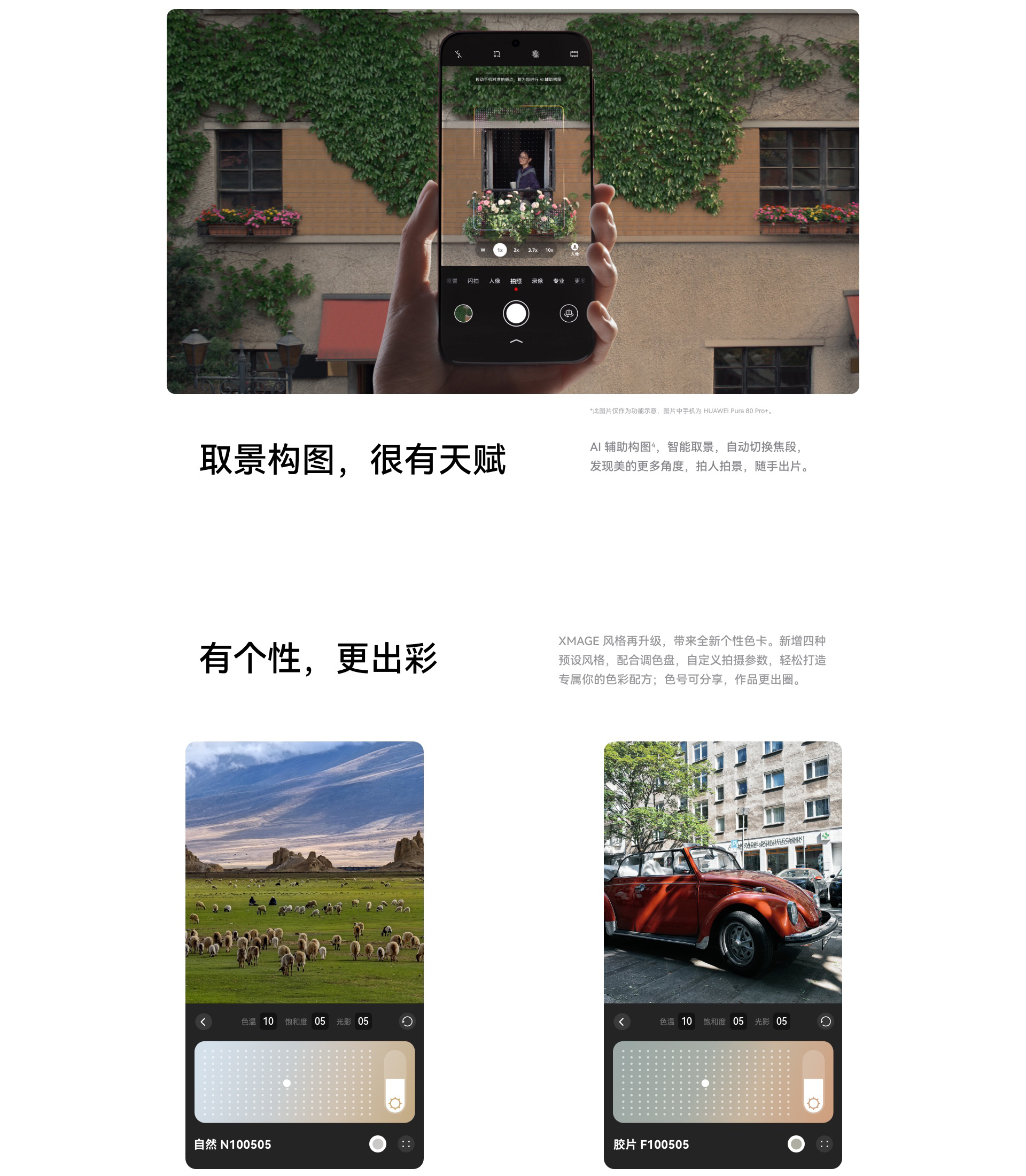 后置拍照功能:后置攝像頭:最大可支持8192 × 6144像素,后置攝像頭:個性色卡、AI輔助構(gòu)圖、超清全景、AI 超清增強(qiáng)、超級夜景、寰宇追月、絢麗星空、星空人像、AI 動態(tài)照片、視頻 HDR Vivid、閃拍、高畫質(zhì)模式、超級微距、微距視頻、微距畫中畫、長焦畫中畫、高像素模式、延時攝影、超大廣角、大光圈虛化、人像模式、專業(yè)模式、慢動作、流光快門、水印、AI 攝影大師、笑臉抓拍、聲控拍照、定時拍照、連拍