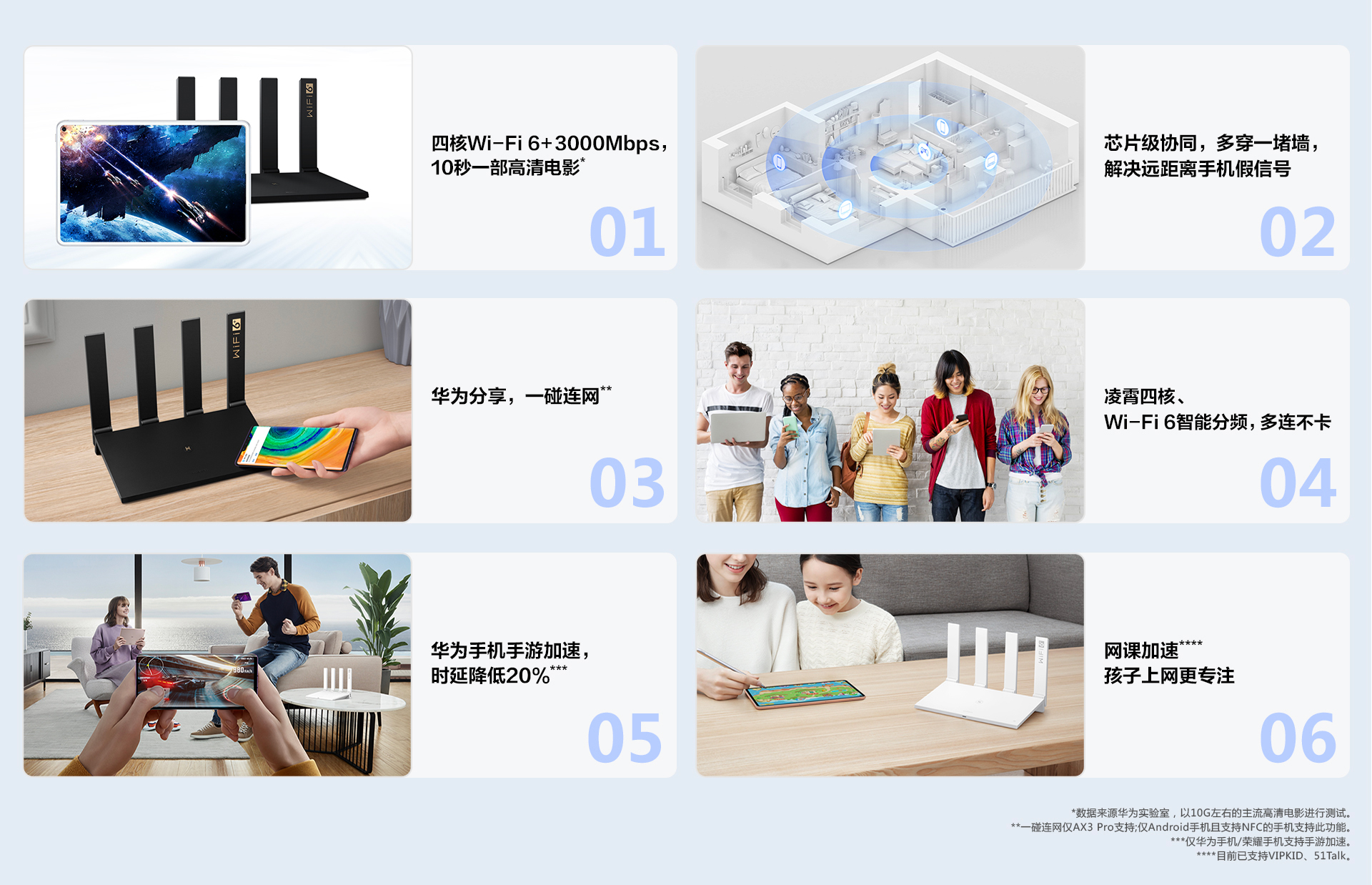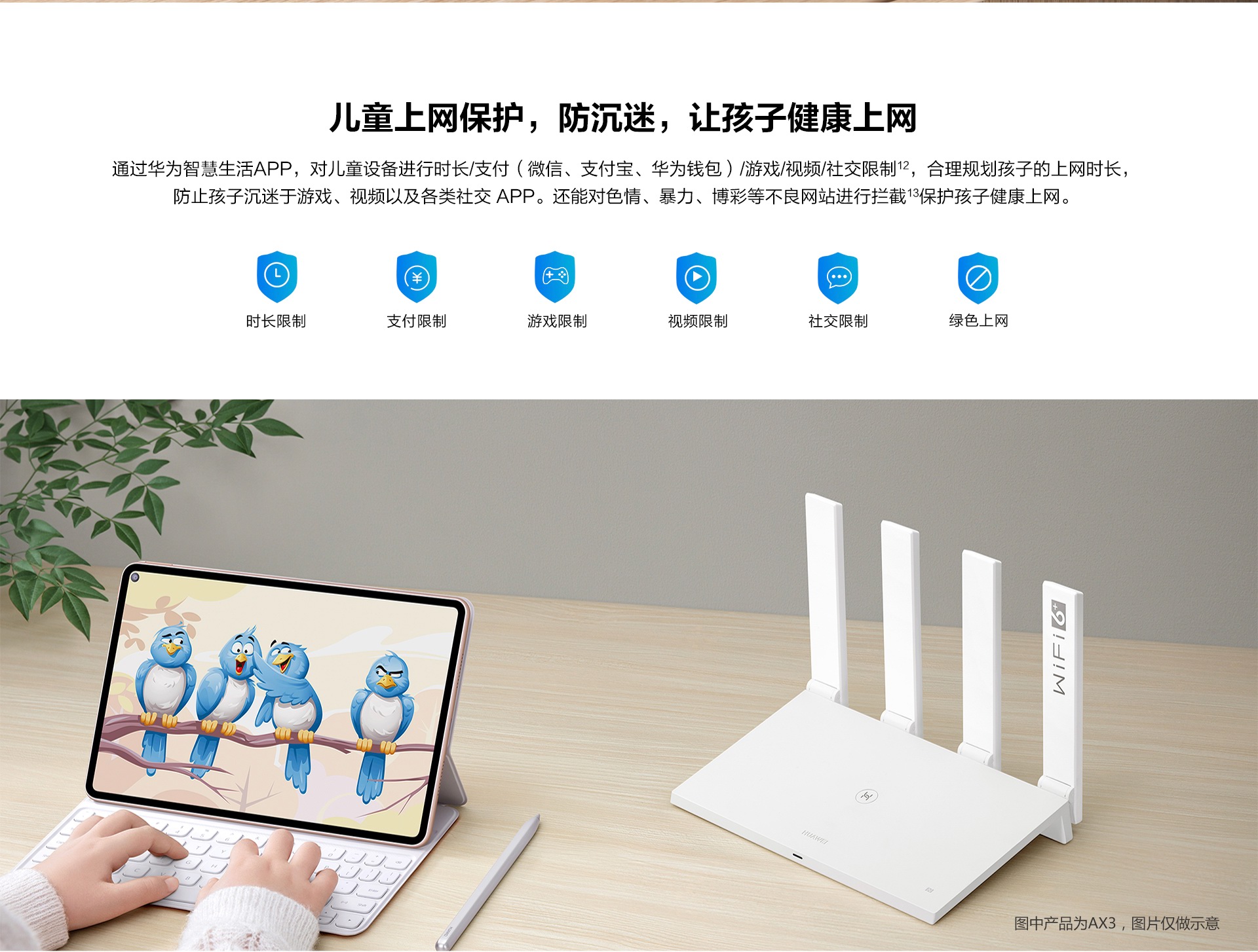 特色功能:華為分享 一碰連網(wǎng)、兒童/老人上網(wǎng)保護(hù)、手游加速、網(wǎng)課加速、雙頻優(yōu)選、網(wǎng)口盲插、信道適時(shí)自動(dòng)優(yōu)化、華為HiLink智能家居、802.11v、IPv4/IPv6、PPPoE/DHCP/靜態(tài)IP/MAC地址克隆/Bridge WAN上網(wǎng)方式、Wi-Fi中繼、Wi-Fi定時(shí)開關(guān)、客人Wi-Fi、連網(wǎng)設(shè)備管理、MAC地址過濾、VPN透傳、DMZ/虛擬服務(wù)器等功能