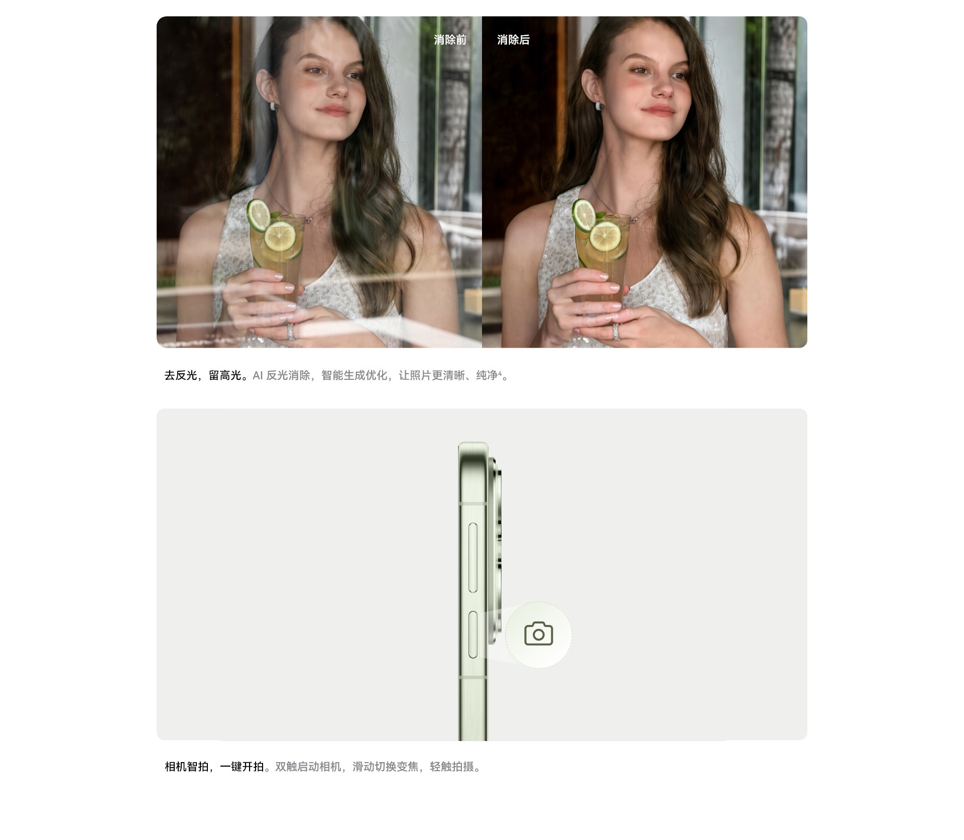 前置拍照功能:前置攝像頭:最大可支持4160 × 3120像素,個性色卡、AI 動態(tài)照片、視頻 HDR Vivid、慢動作、人像模式、延時攝影、笑臉抓拍、自拍鏡像、聲控拍照、定時拍照